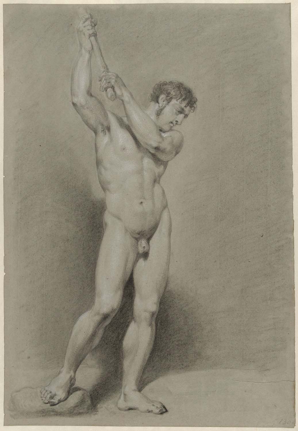 Staand mannelijk naakt met een stok boven het hoofd