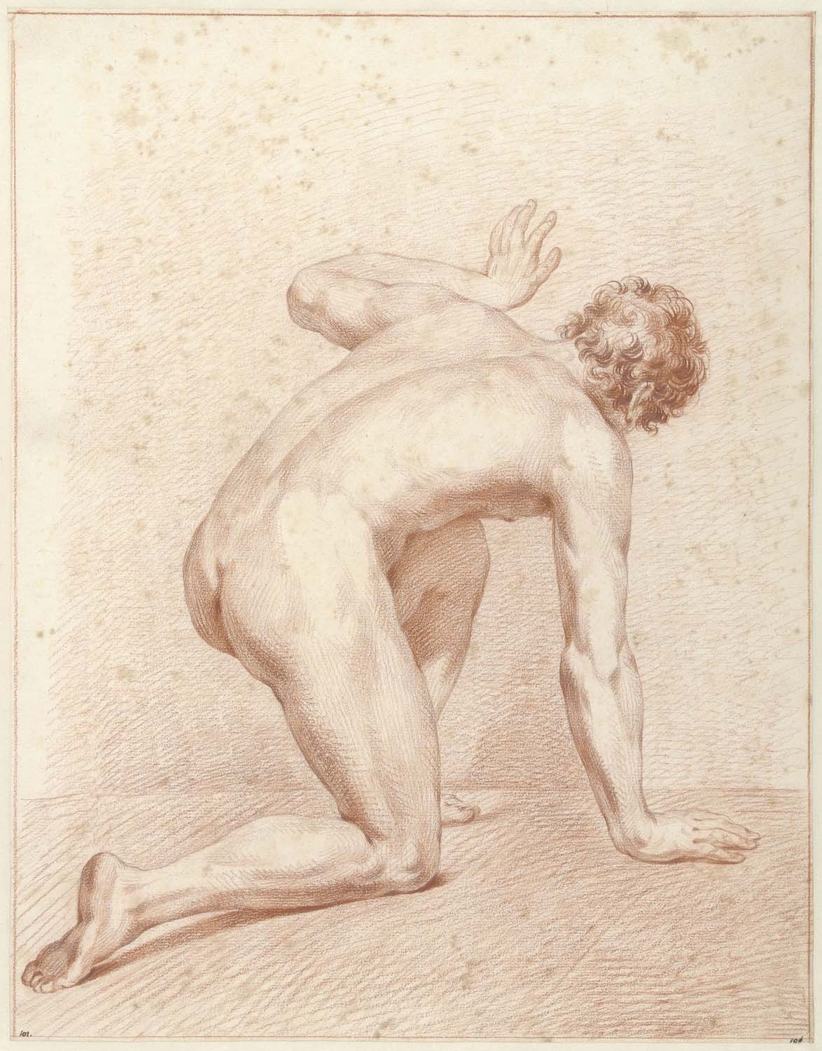 Mannelijk naakt, knielend, op de rug gezien