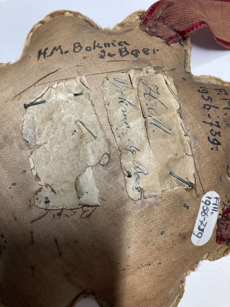 Speldenkussen met de letters IDR, twee kroontjes en ...