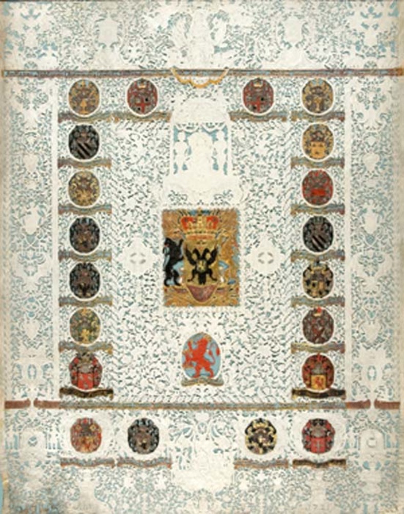 Knipwerk met twintig wapens en het stadswapen van Ni...