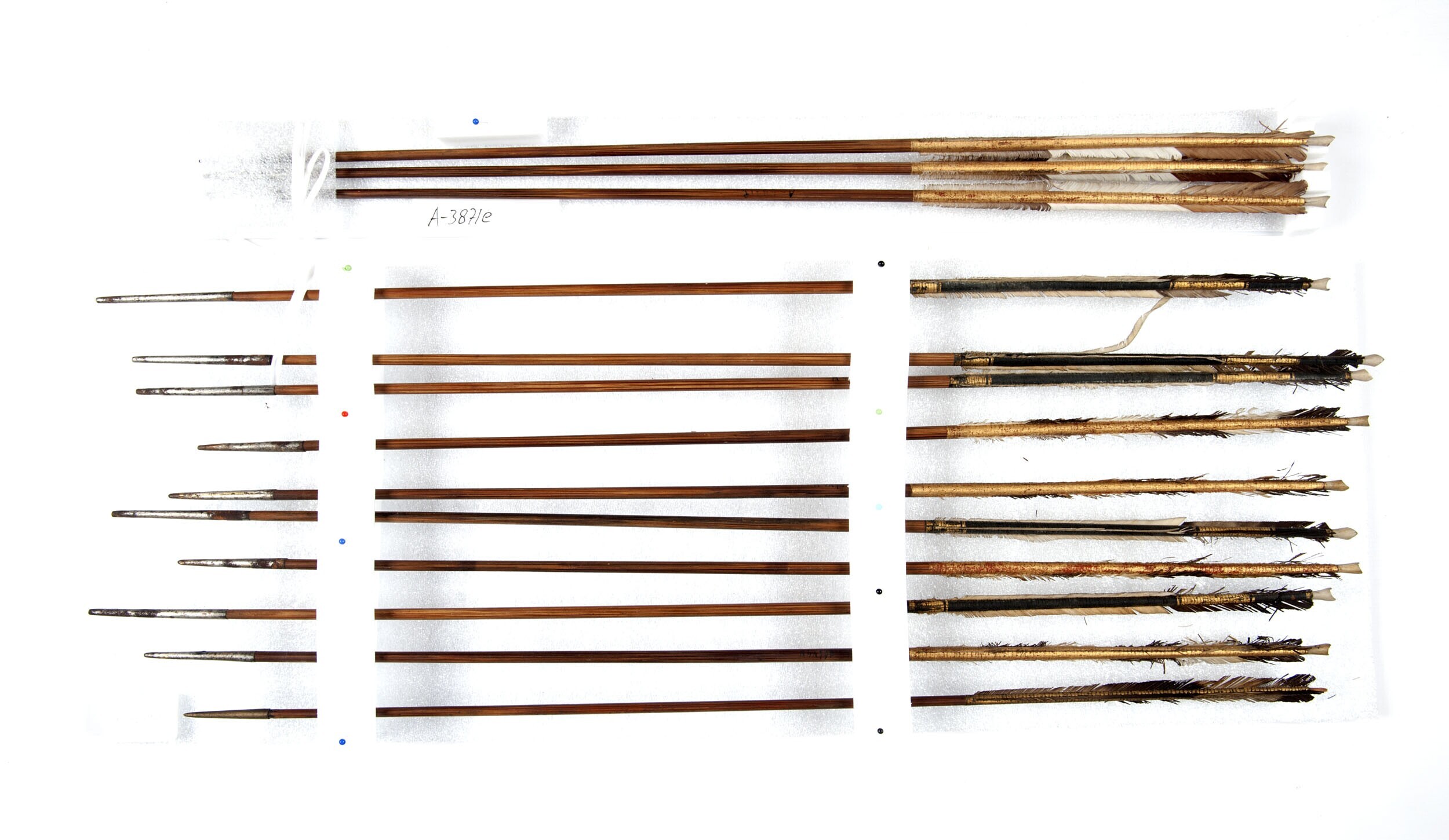 Negen pijlen met ijzeren punt en houten schacht, ged...