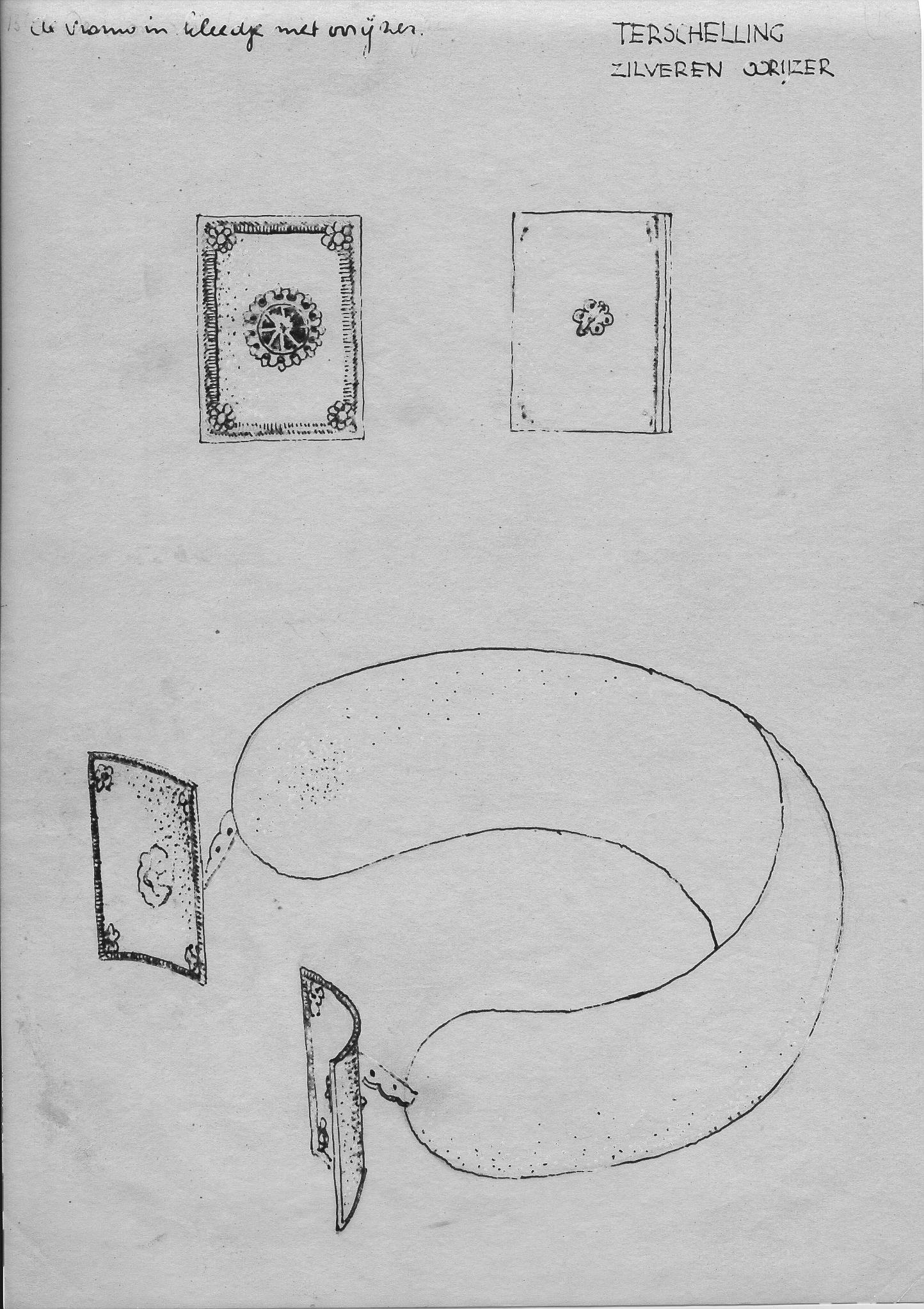 Tekening van een zilveren oorijzer, Terschelling (op...