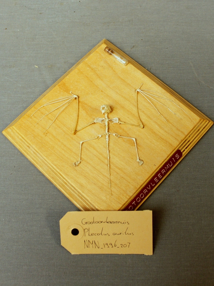 Grootoorvleermuis; skelet; op plank
