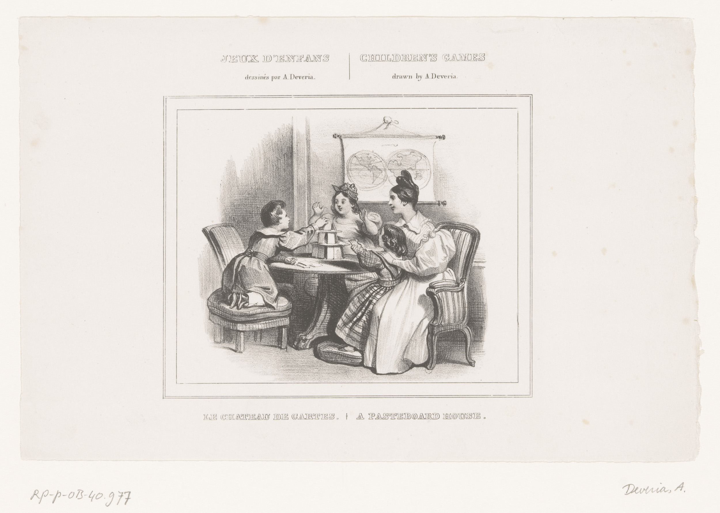 Moeder met drie kinderen die een kaartenhuis bouwen