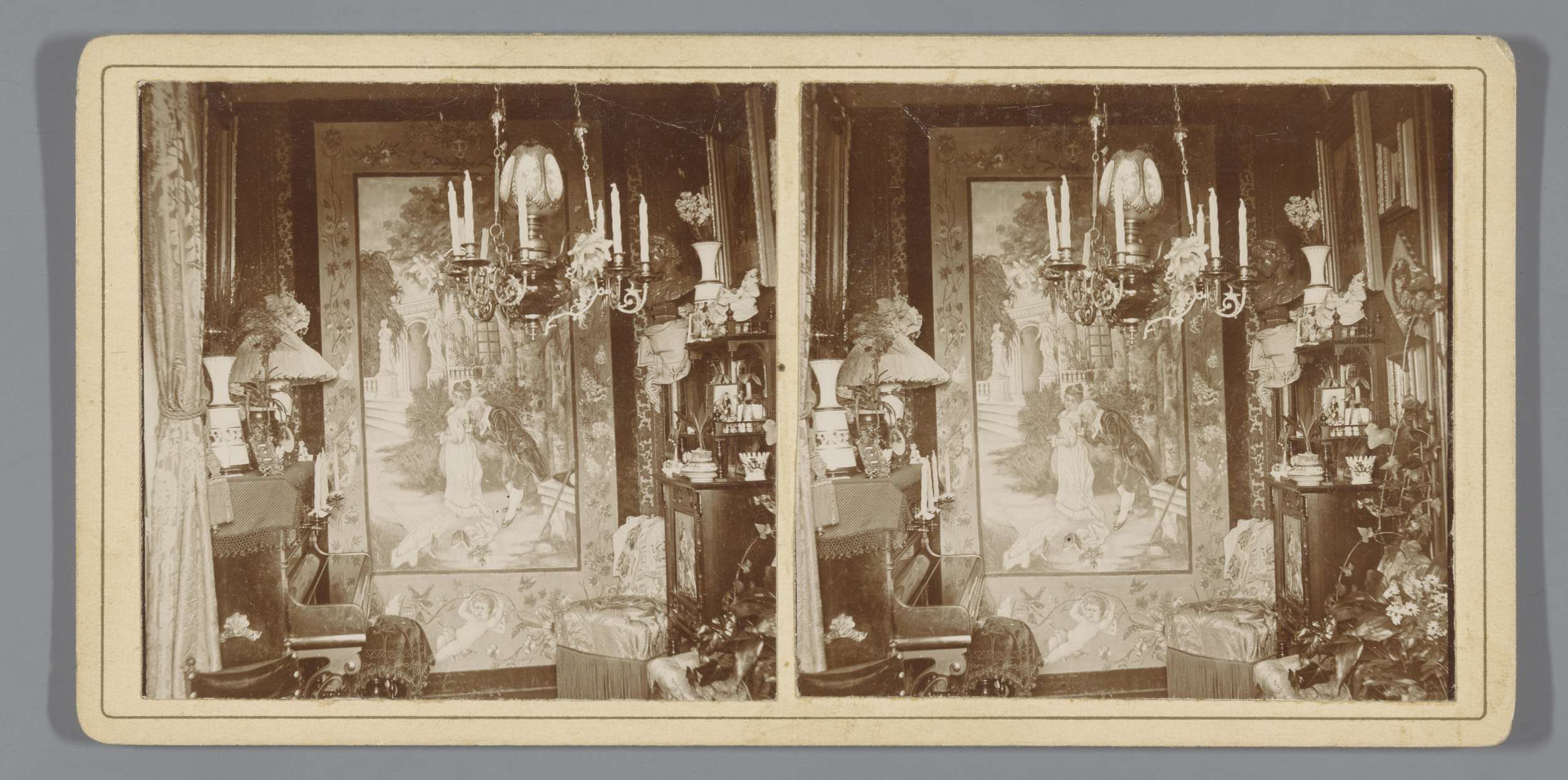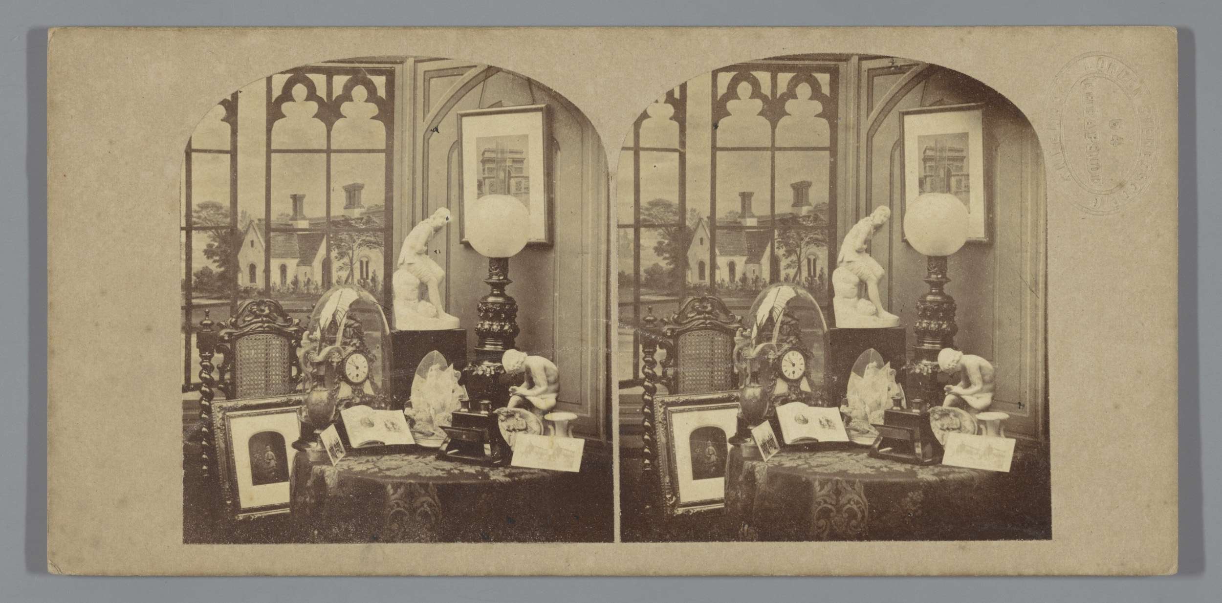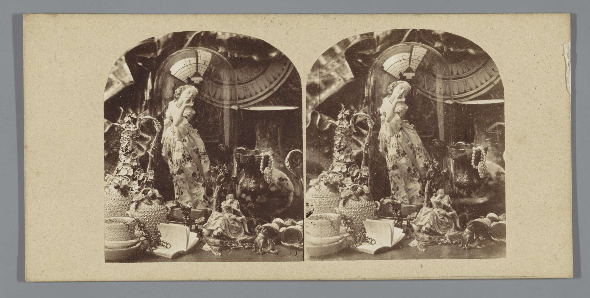 Stilleven met beelden, stolp, vaas en boek