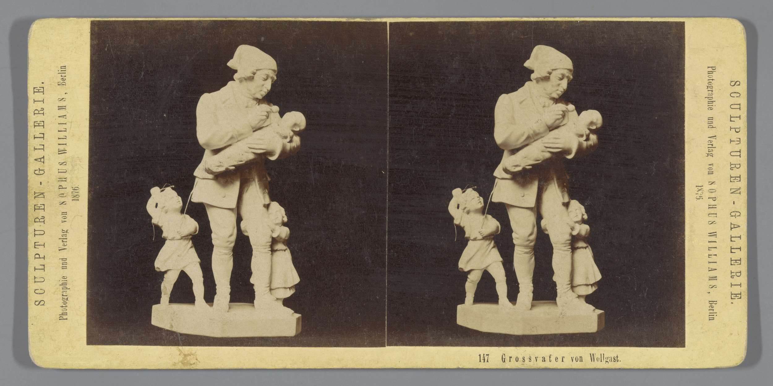 Sculptuur van grootvader met drie kleine kinderen