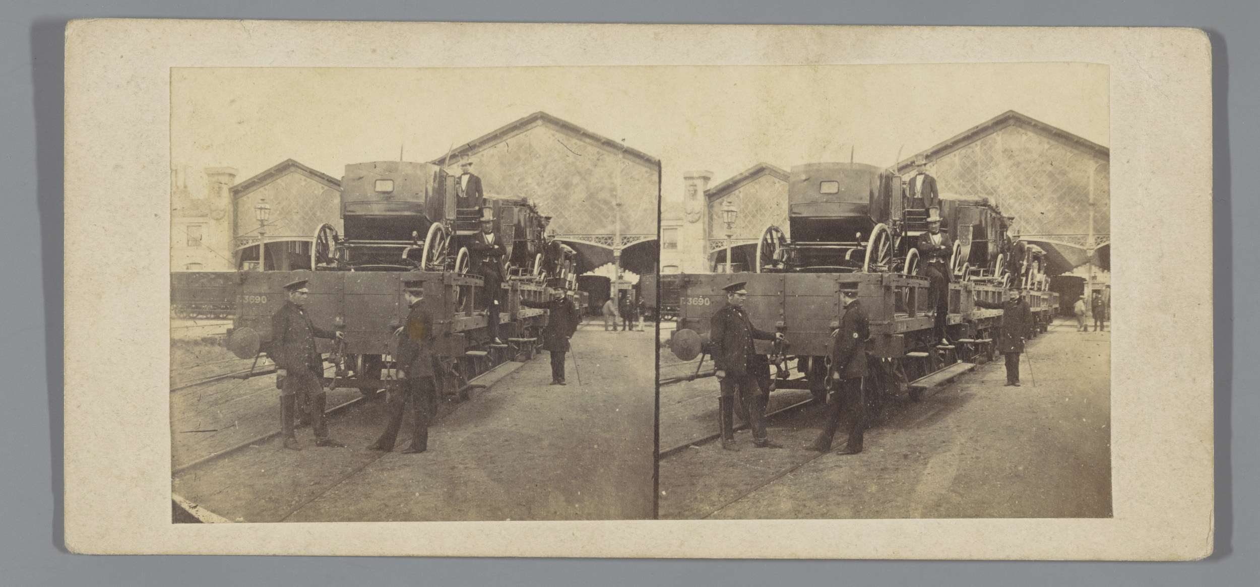 Mannen poseren op en voor een treinwagon met koetsen