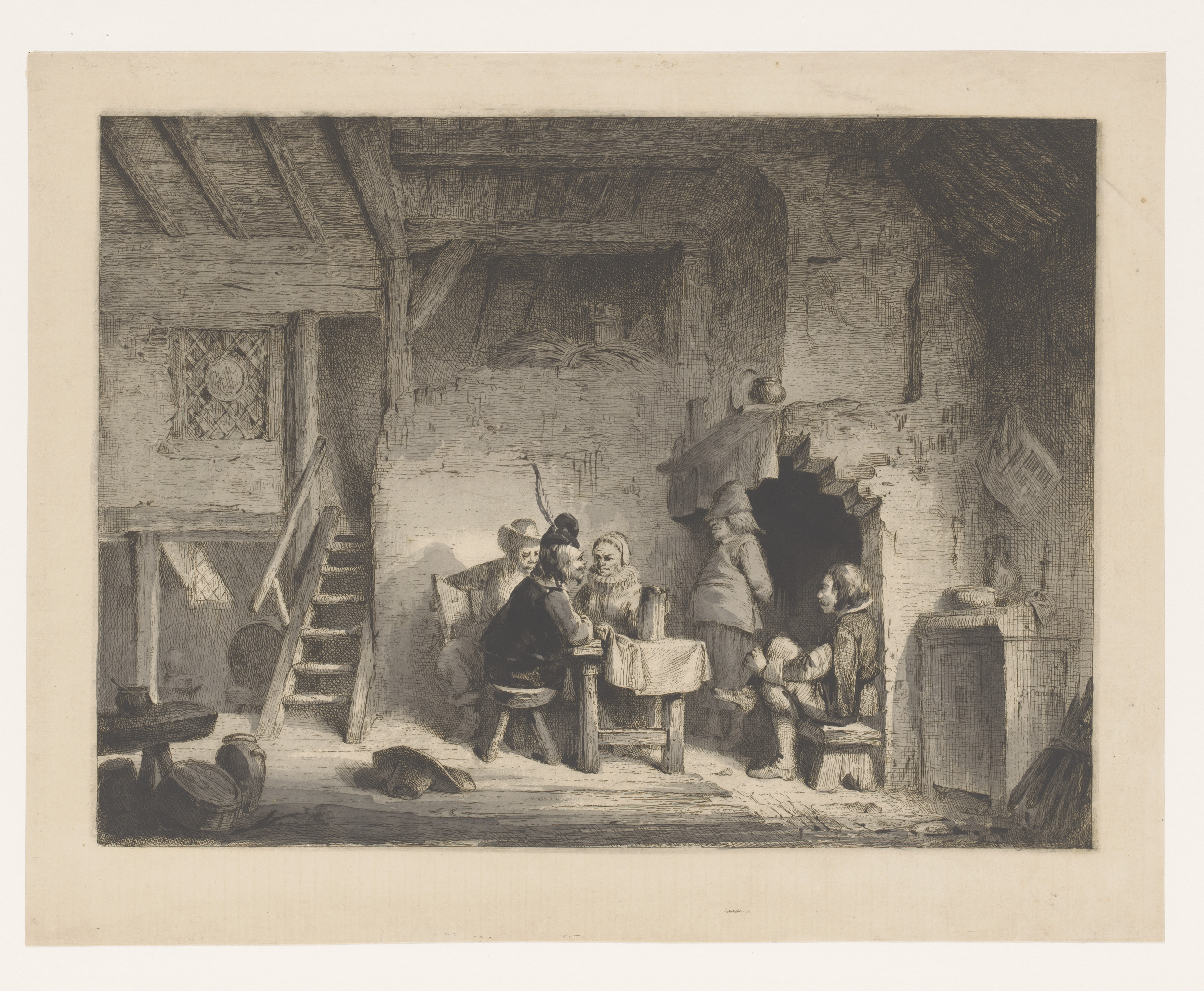 Gezelschap in zestiende-eeuwse kleding in een kroeg