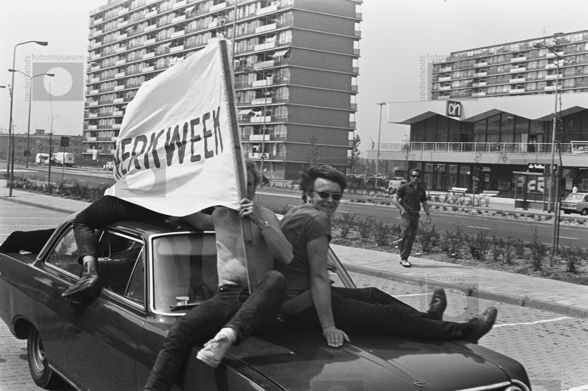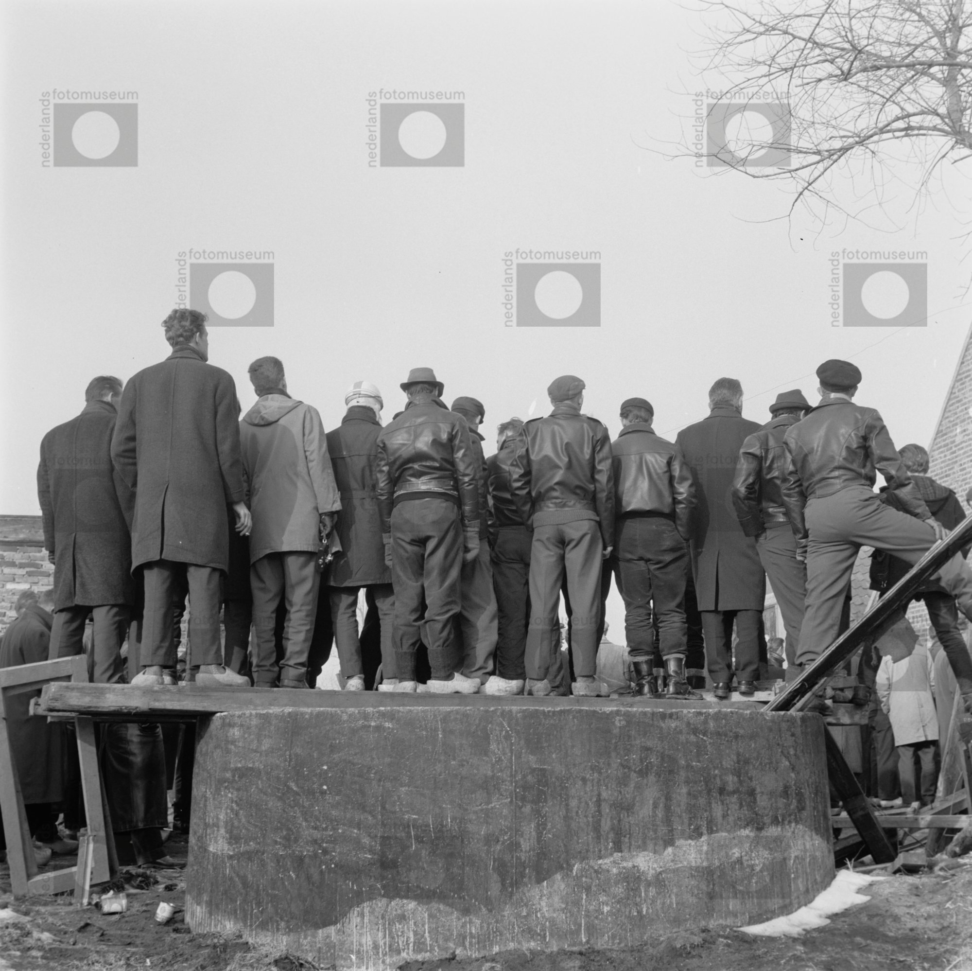 Zaandam. Actievoerende bouwvakkers op de bouwplaats,...