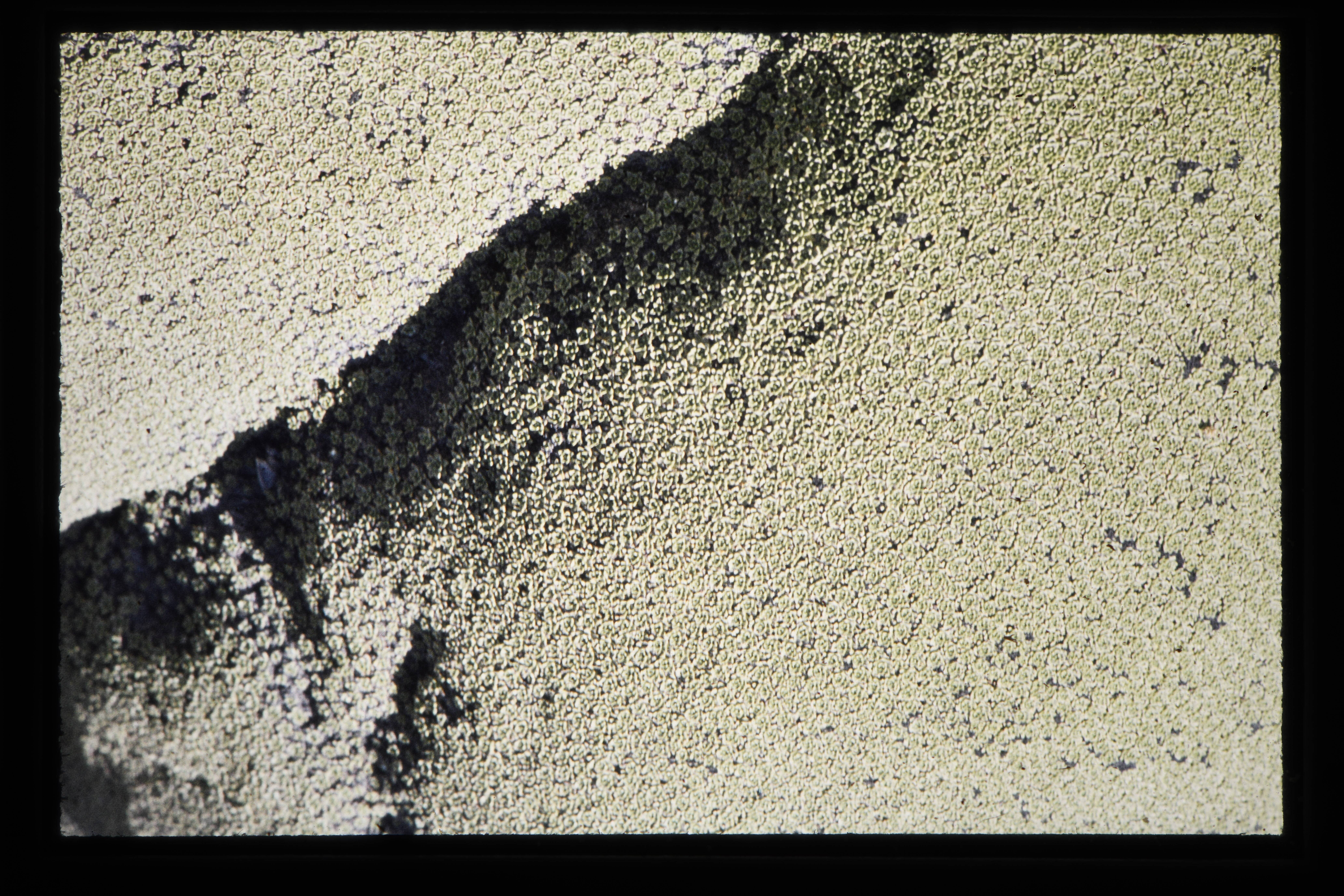 'Close-up begroeide steen, met mos.'