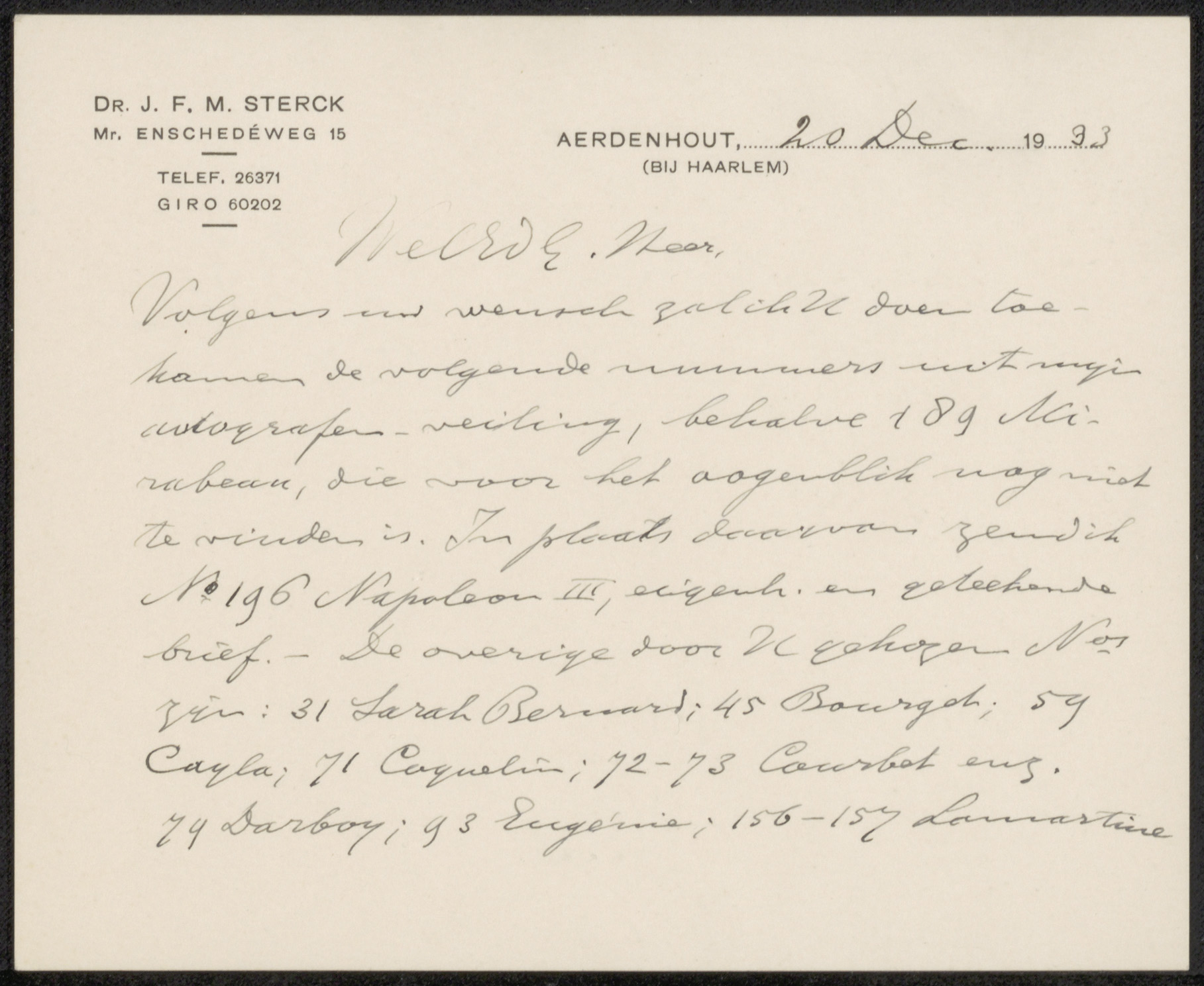 Brief aan de heer J.J.W.B. van Dijck