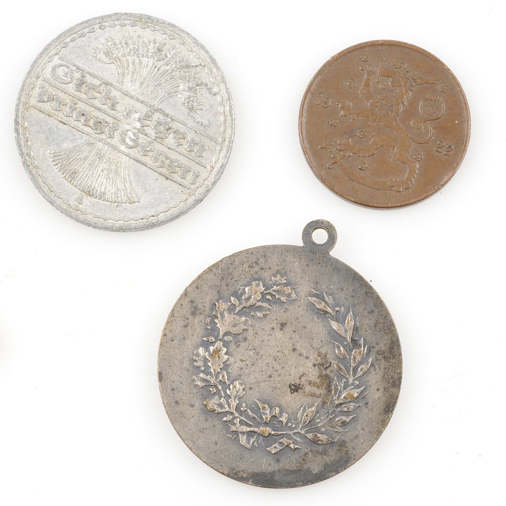 twee munten en een medaille: 50pf. 1 pennia