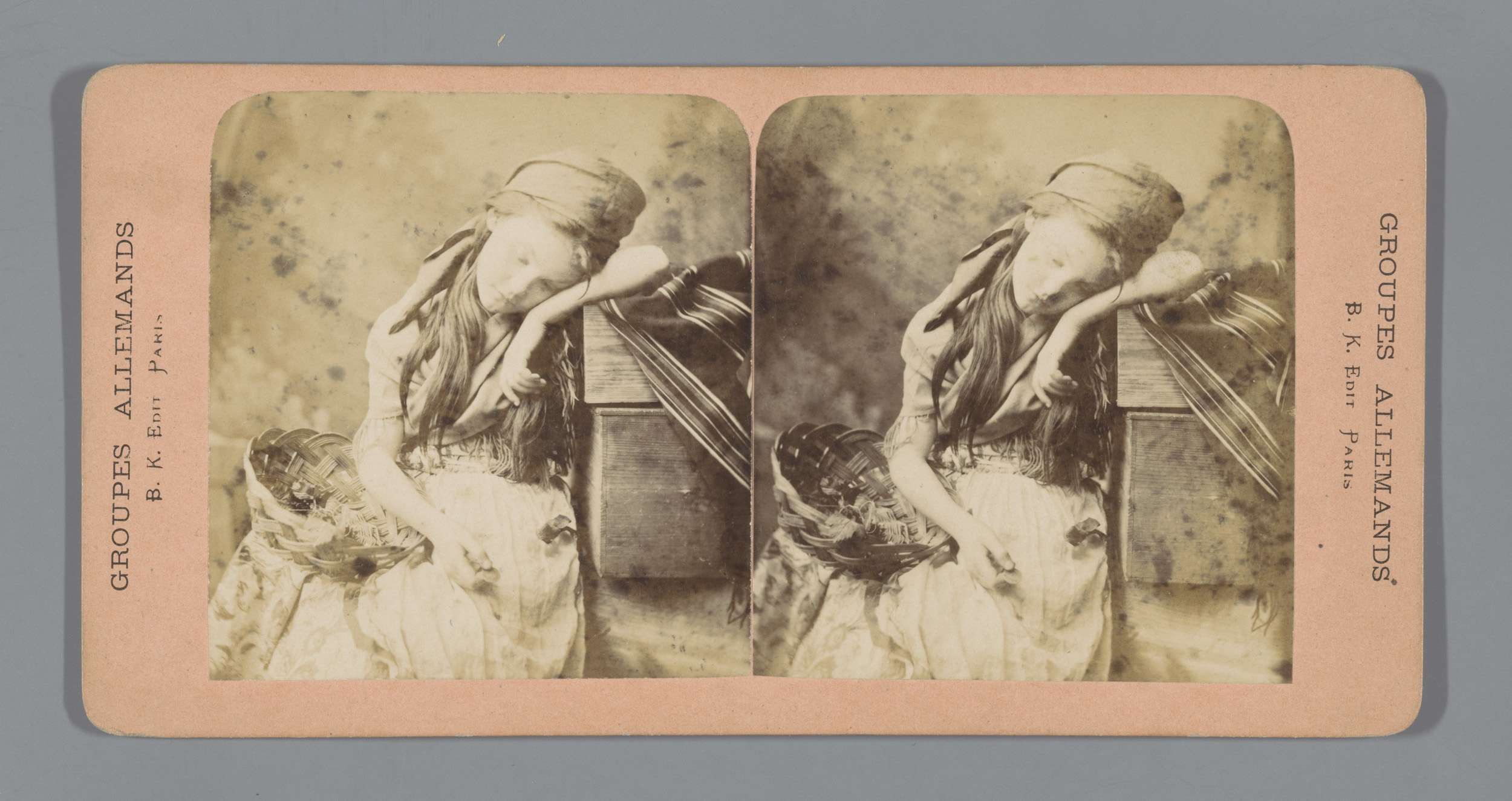 Meisje met mand leunend tegen stapel kisten