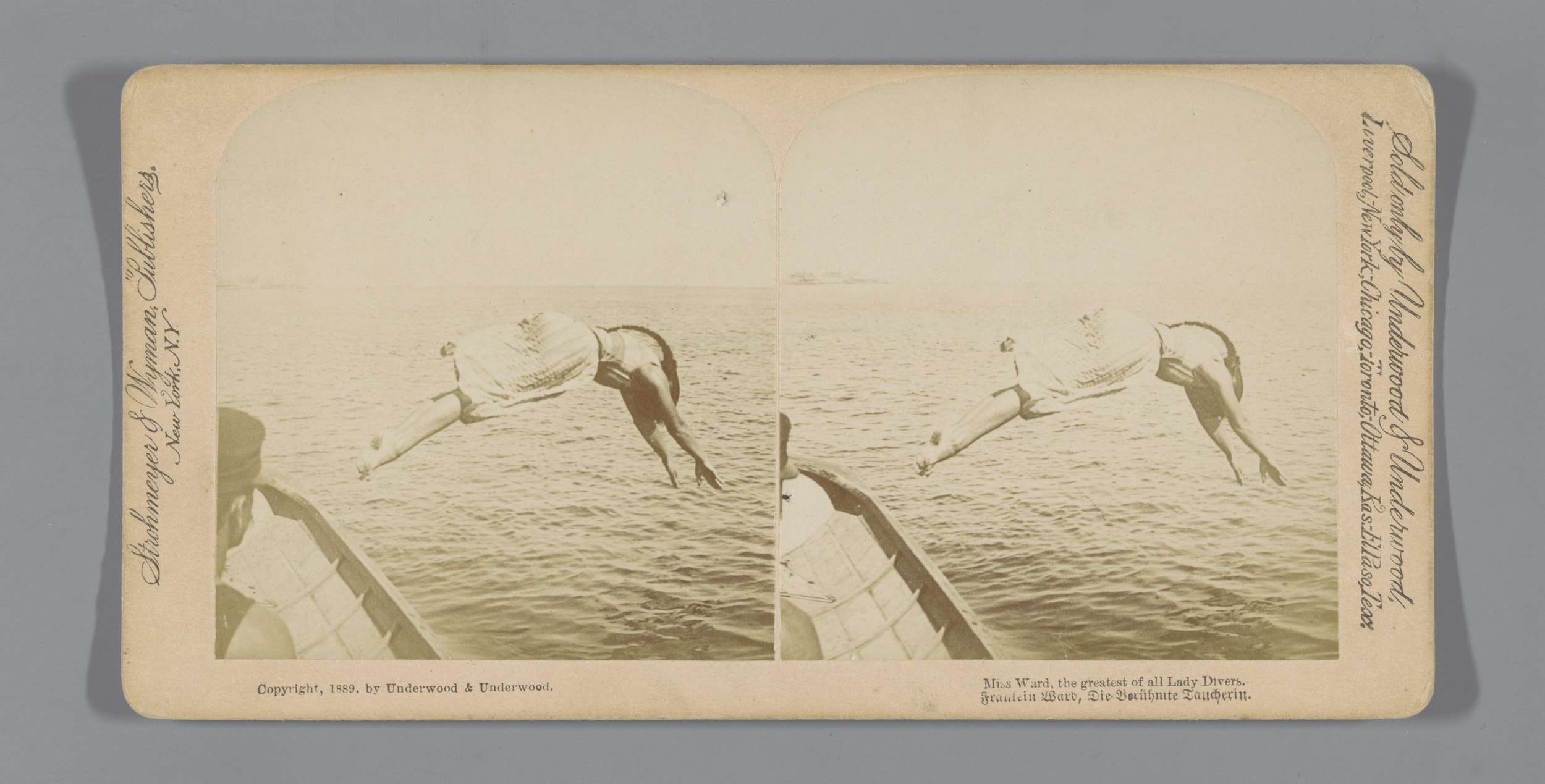 Vrouw gekleed in jurk duikt vanaf boot in het water