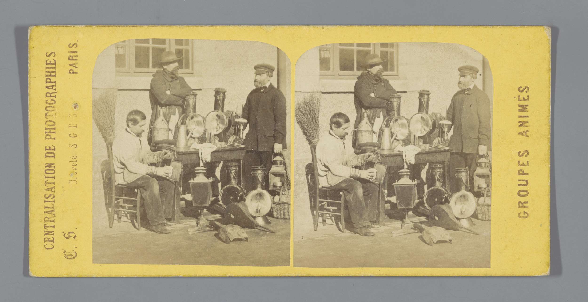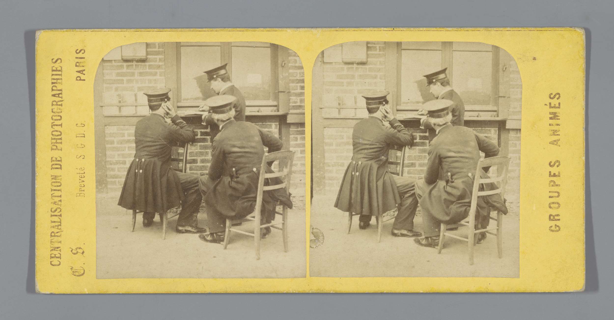 Drie mannen in uniform zitten buiten voor een raam