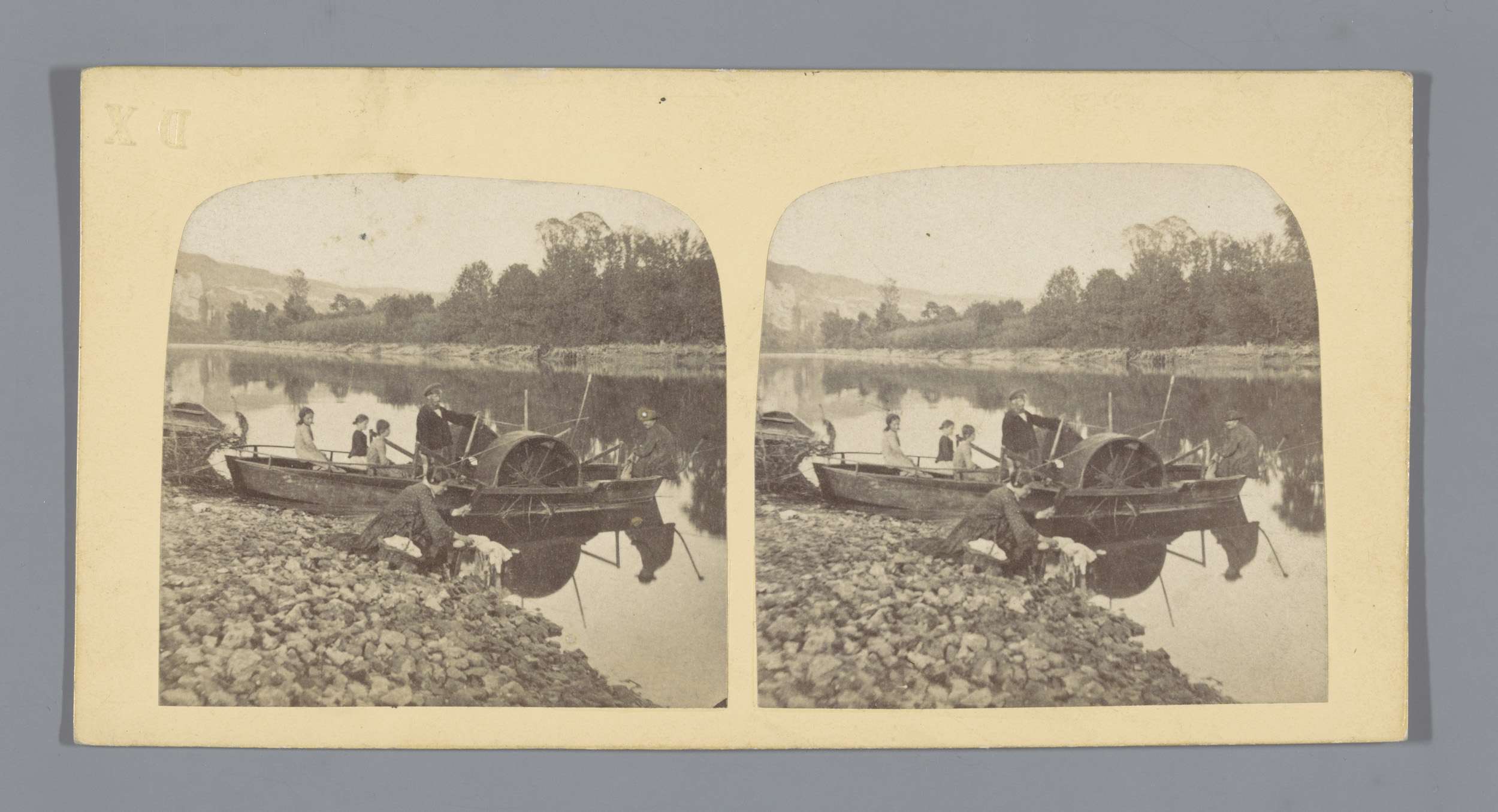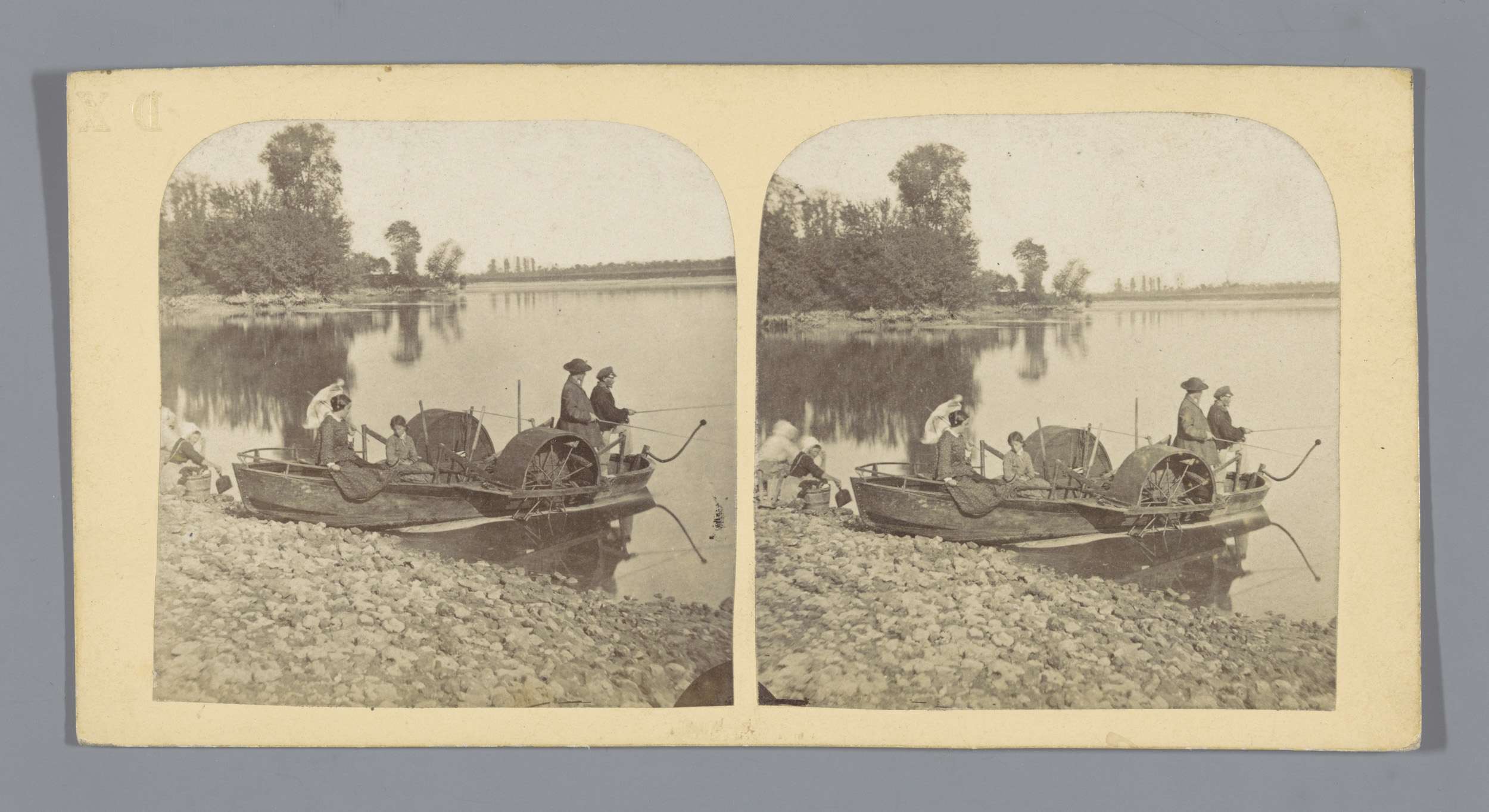 Mensen in een veerboot op de waterkant, op de achter...