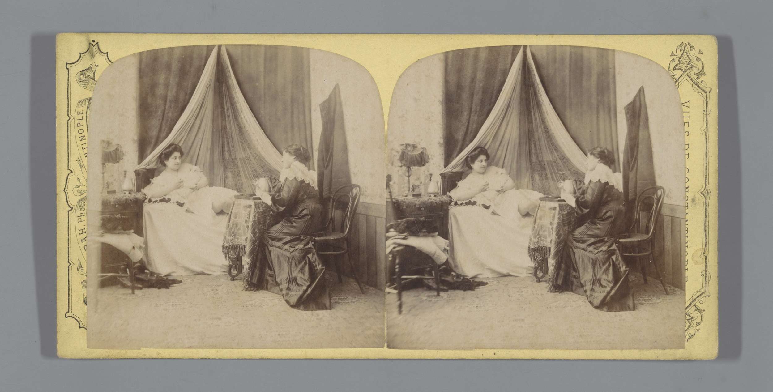 Slaapkamer met vrouw liggend op bed en vrouw zittend...