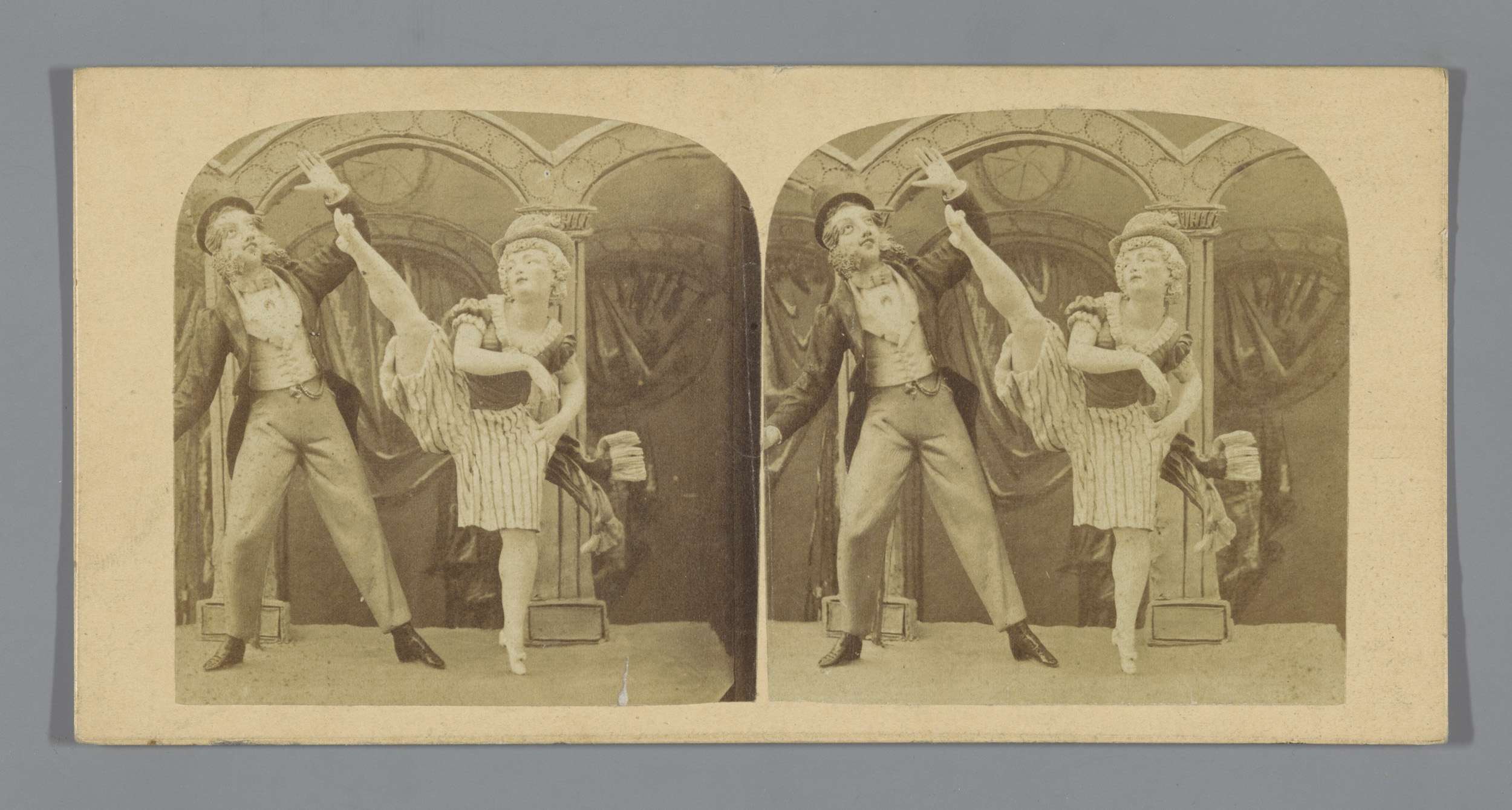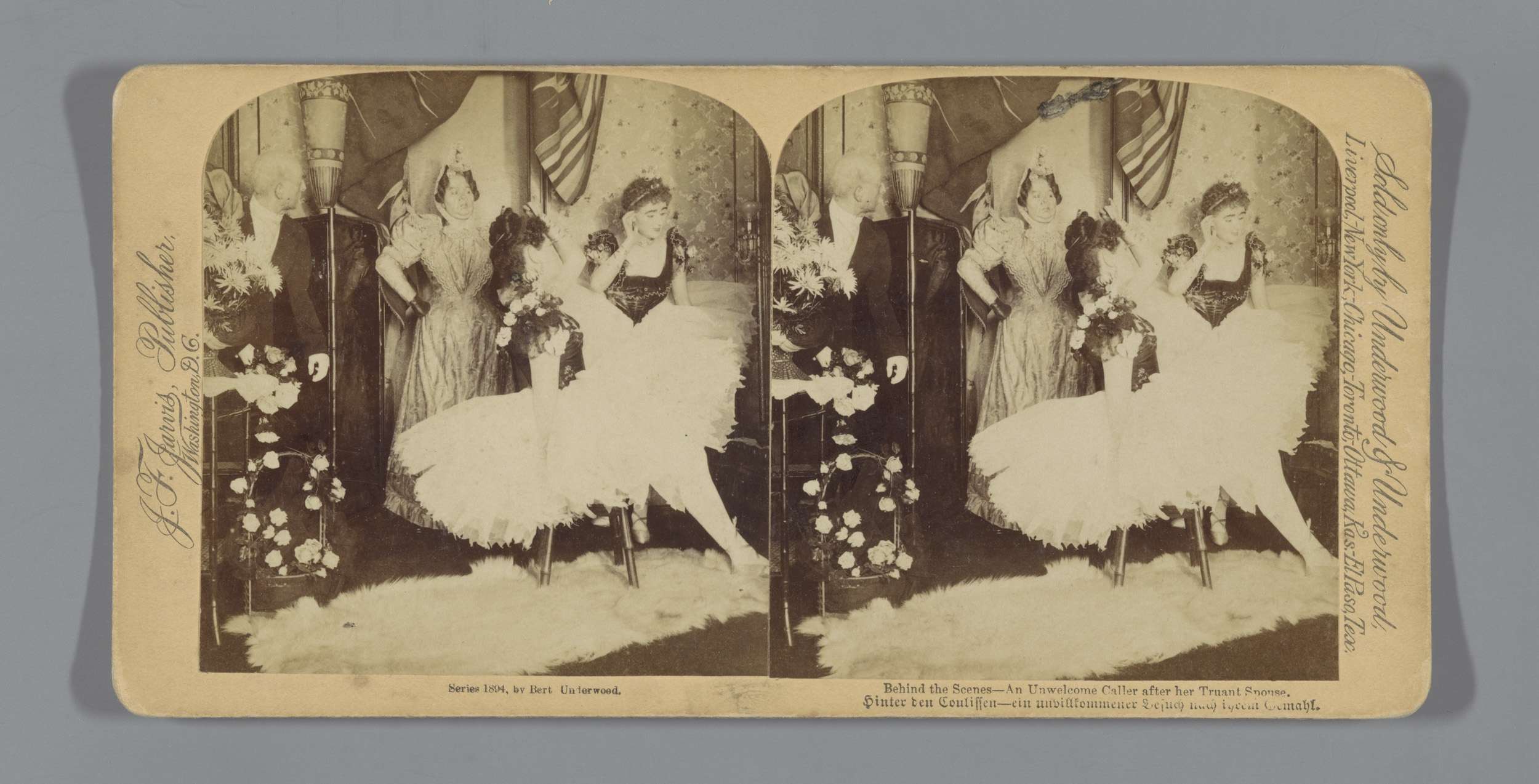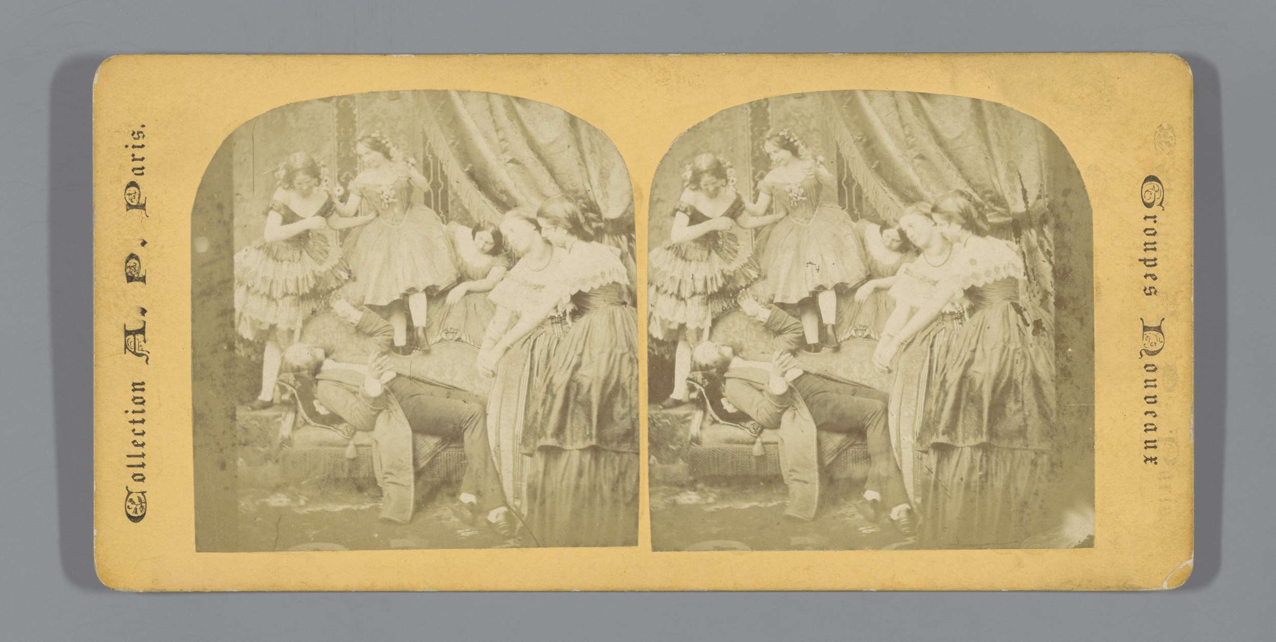 Twee danseressen achter de schermen met een man en e...
