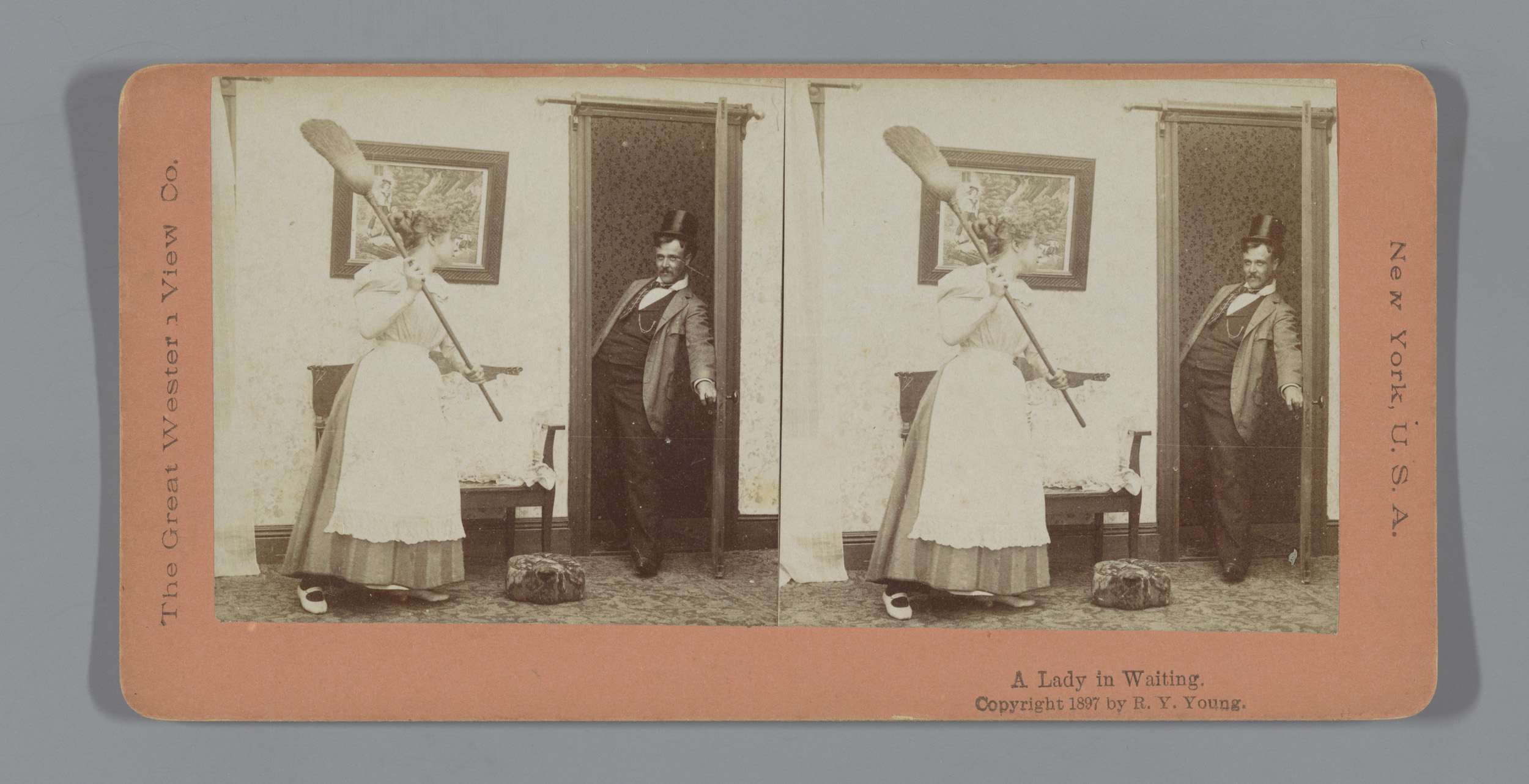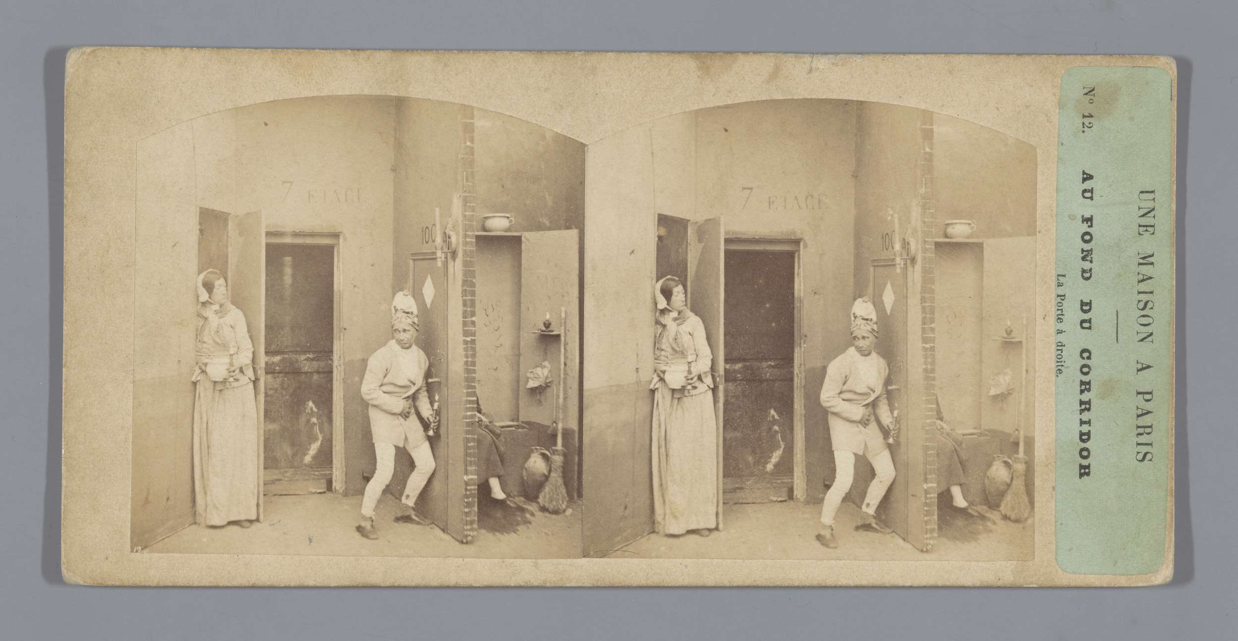 Vrouw met bezem wacht man op in deuropening