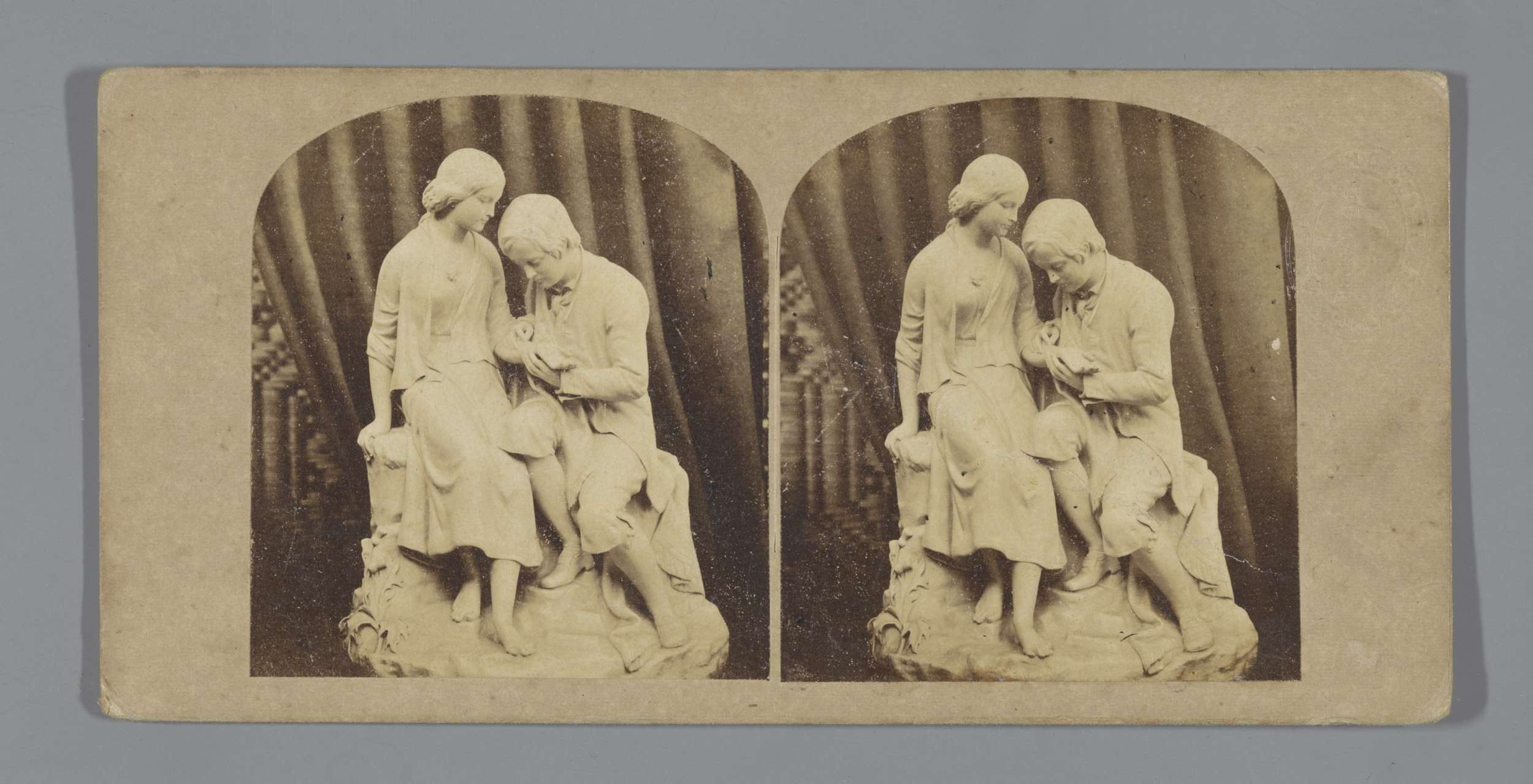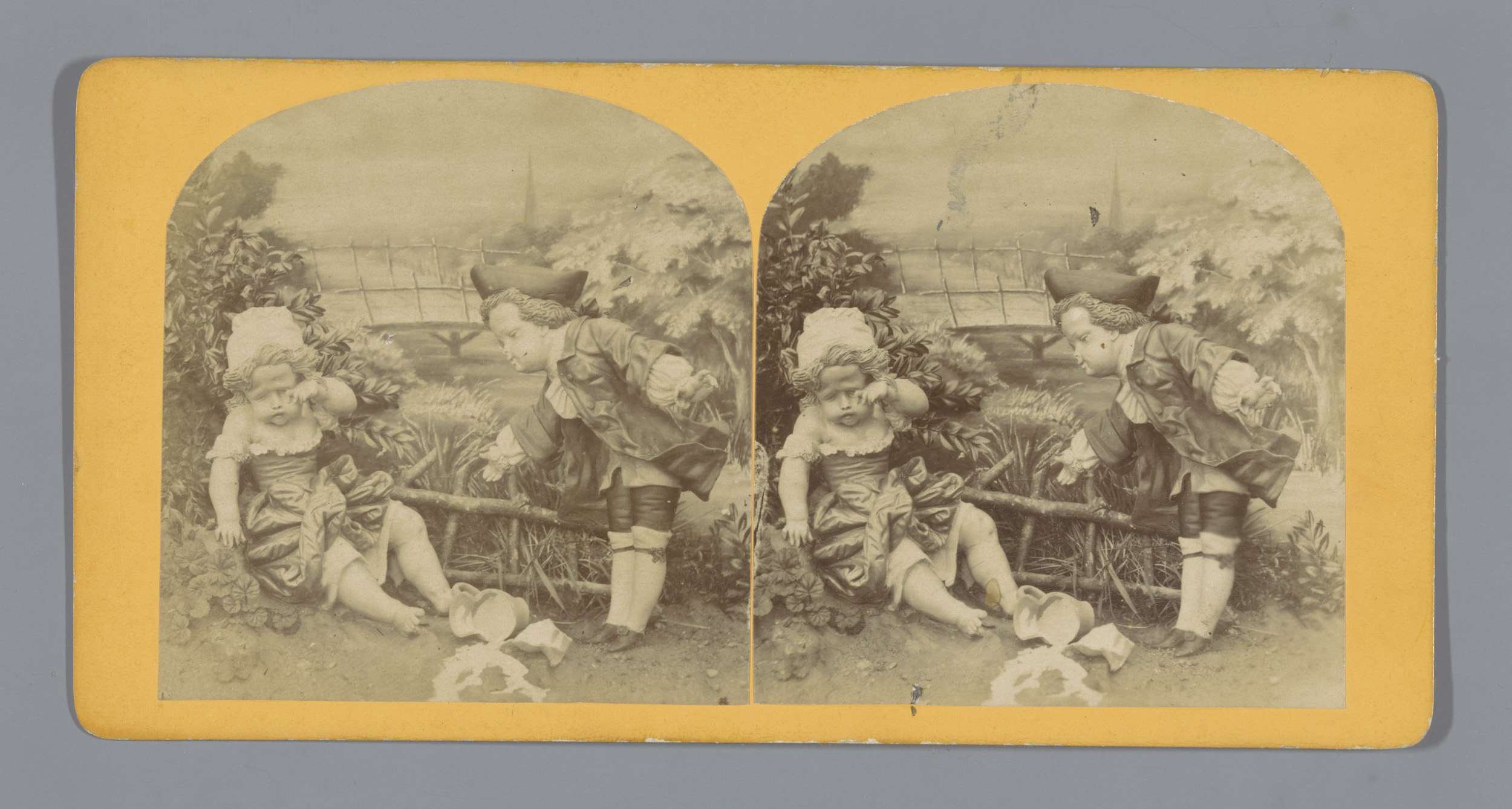 Enscenering met twee poppen, voorstellend een huilen...