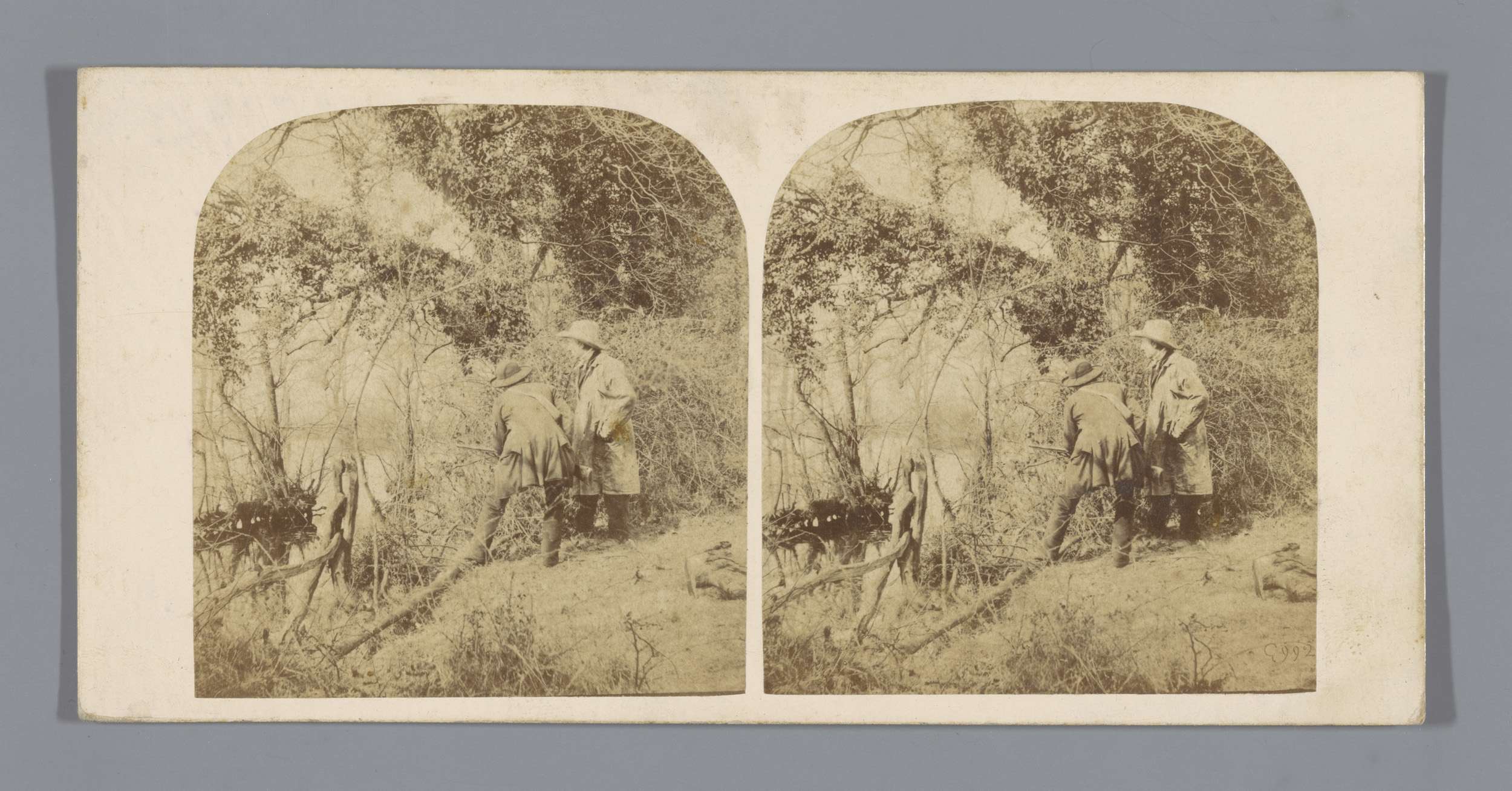 Twee mannen aan de waterkant in een bos