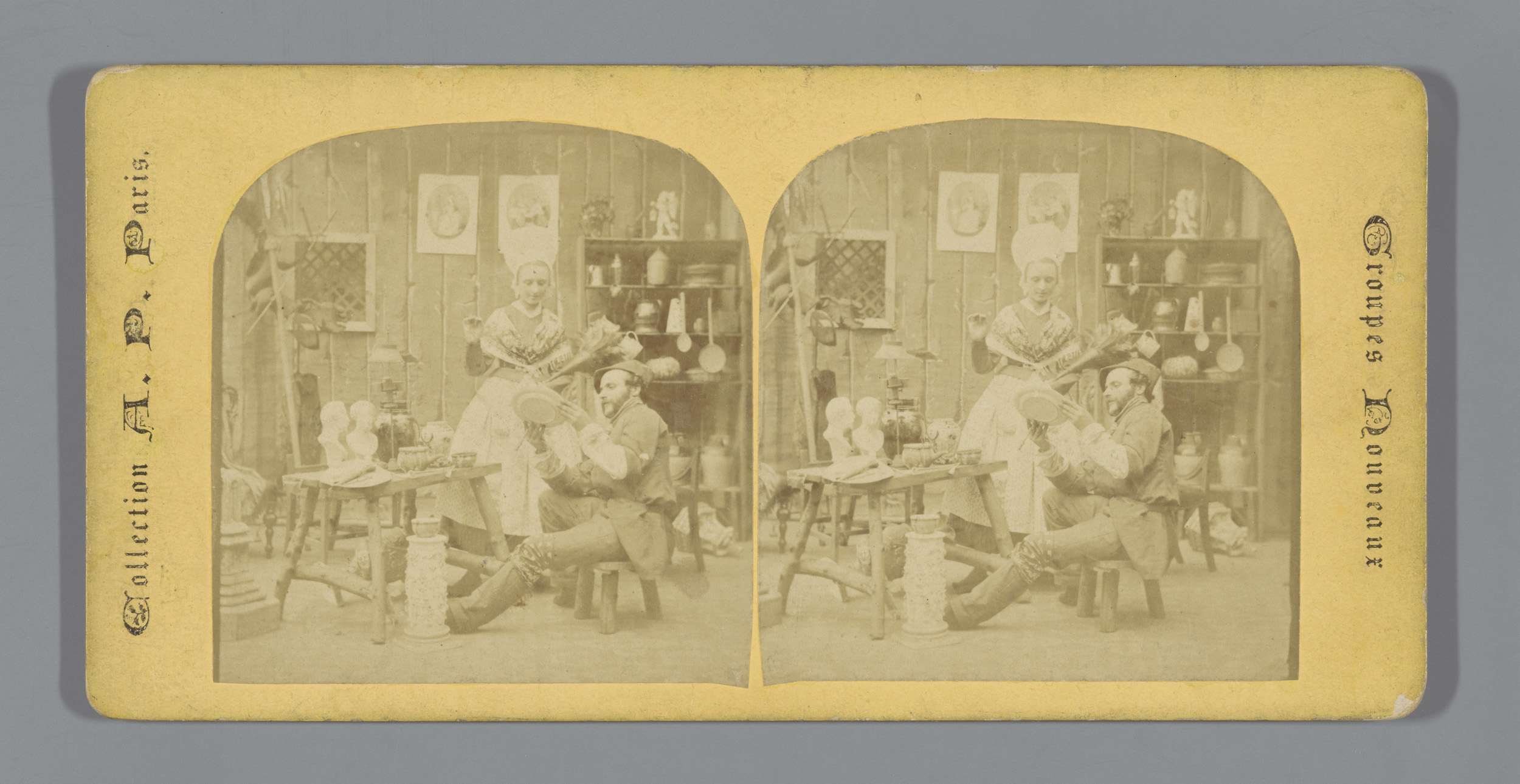 Keramist in atelier met jonge vrouw in klederdracht