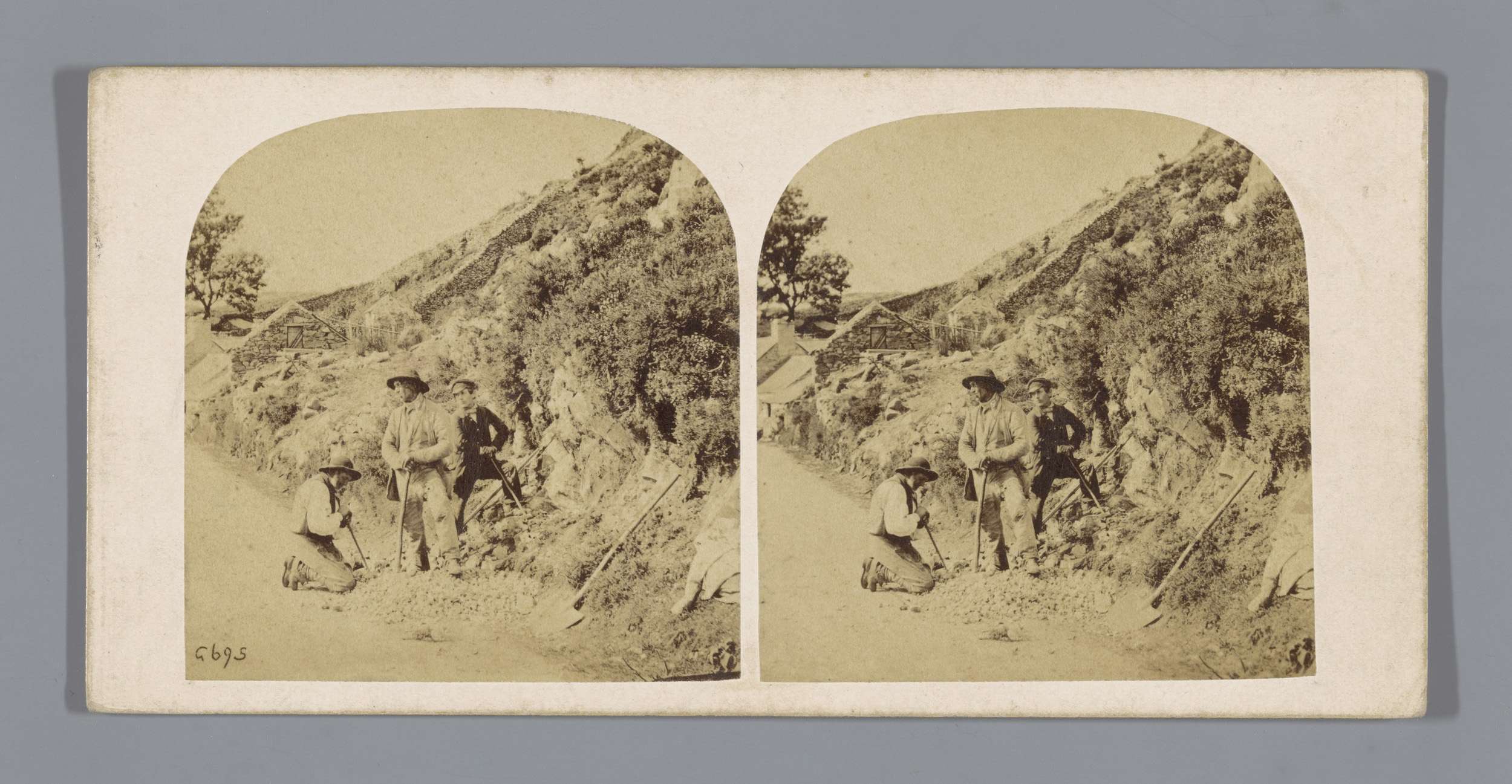 Drie steenhakkers op een landweg