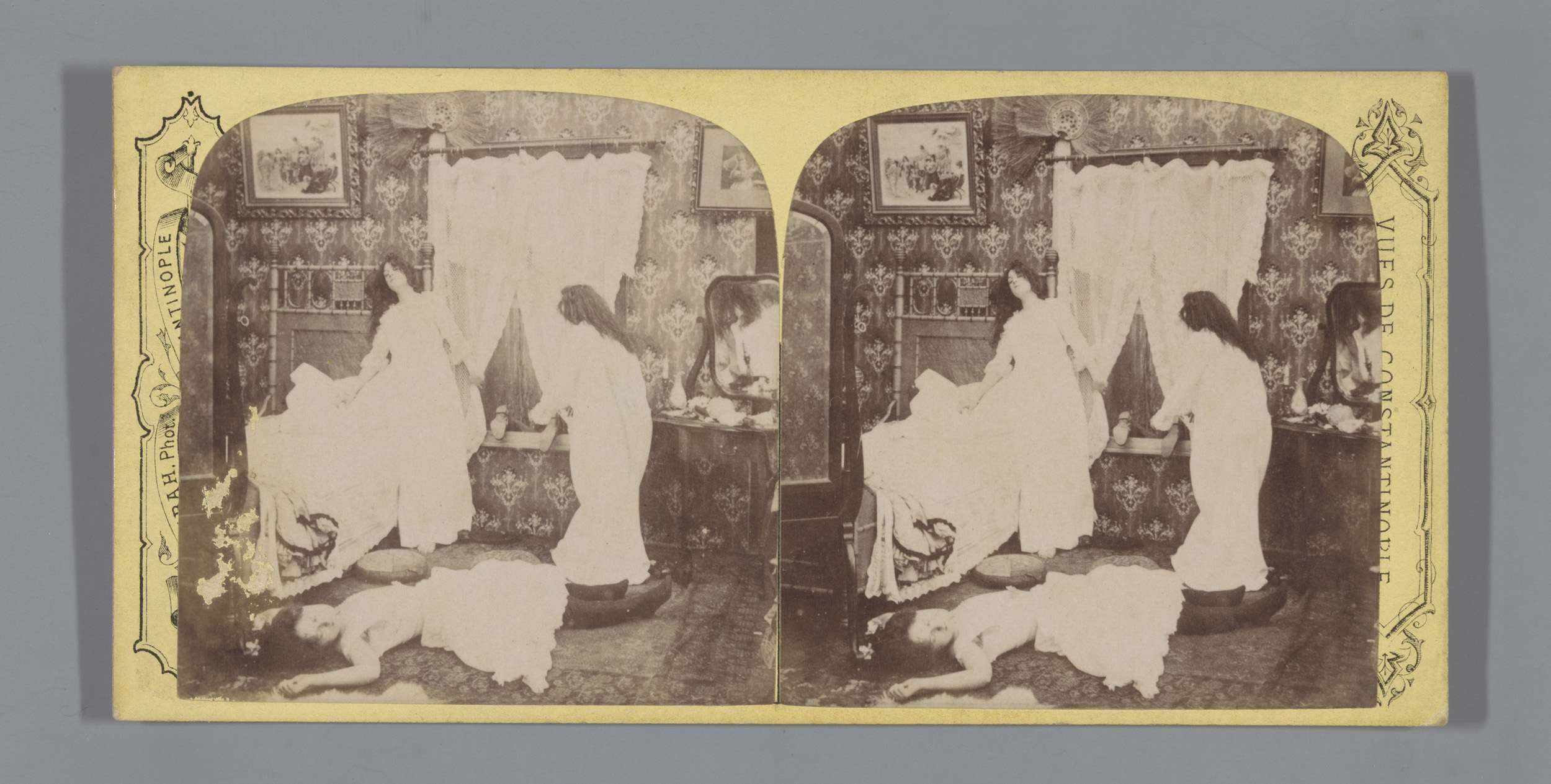 Theatrale voorstelling van een vrouw in bed met daar...