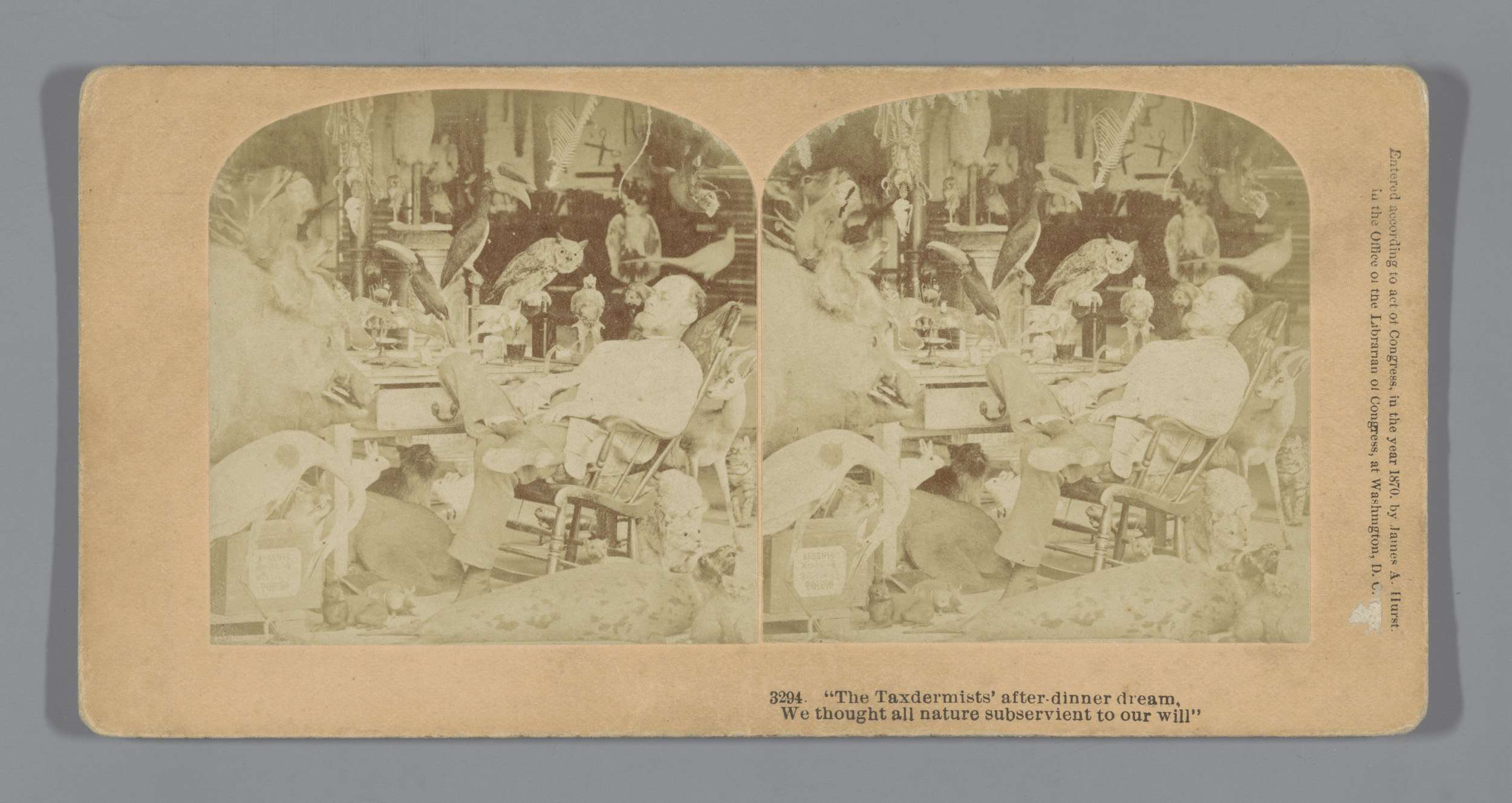 Man slapend in stoel te midden van opgezette dieren