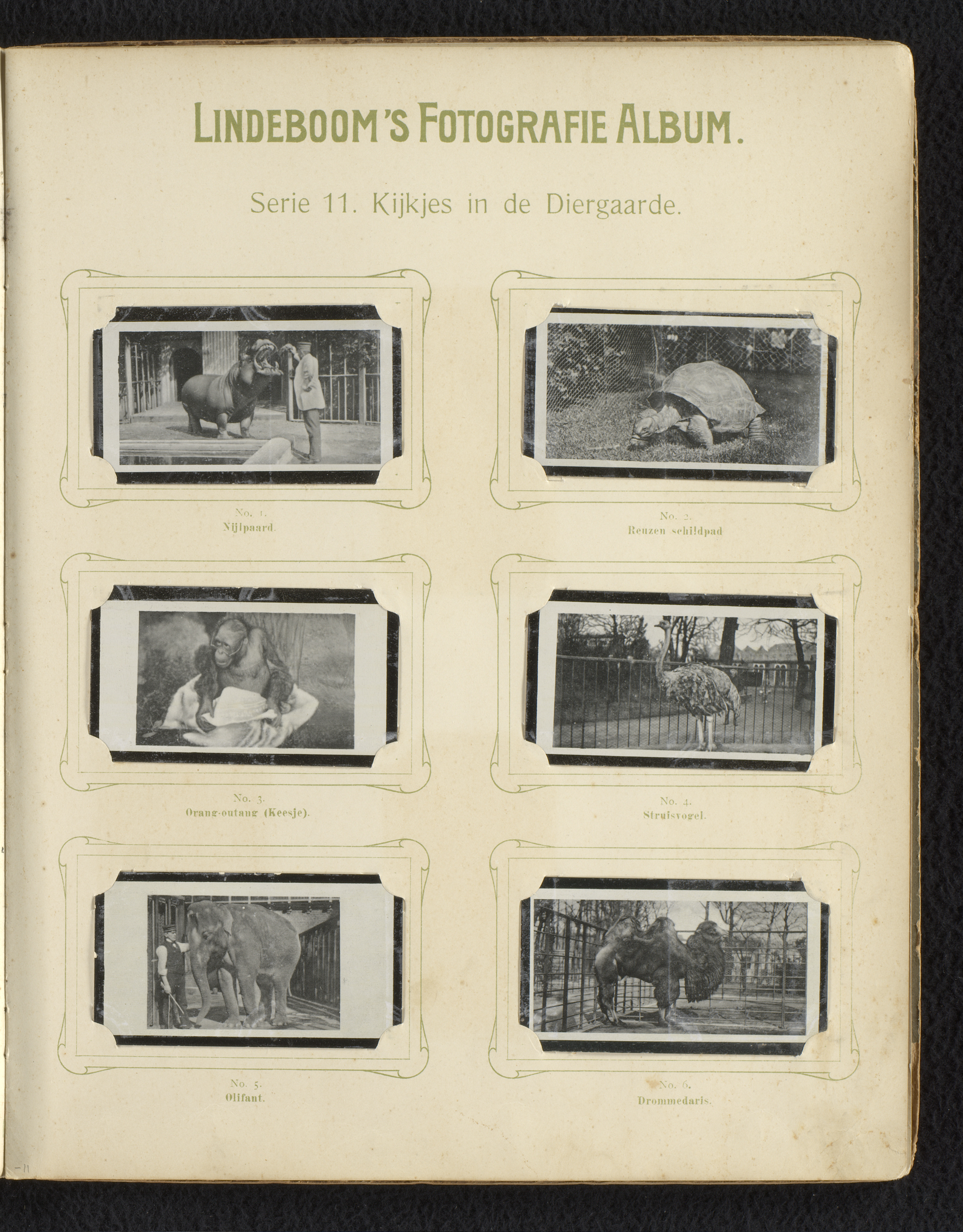 Zes reproducties van foto's van dieren en hun verzor...