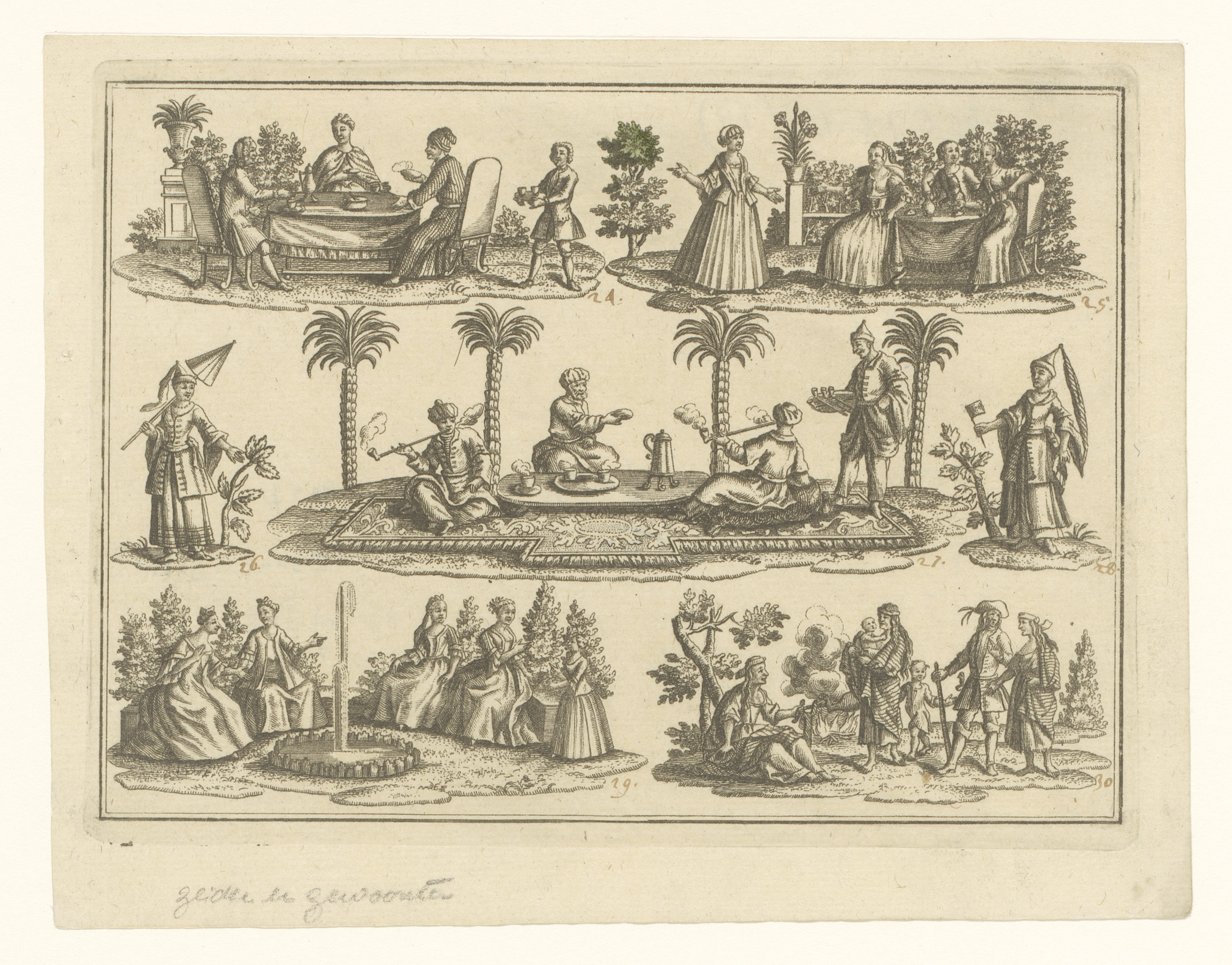 Rokende, drinkende en pratende gezelschappen uit ver...