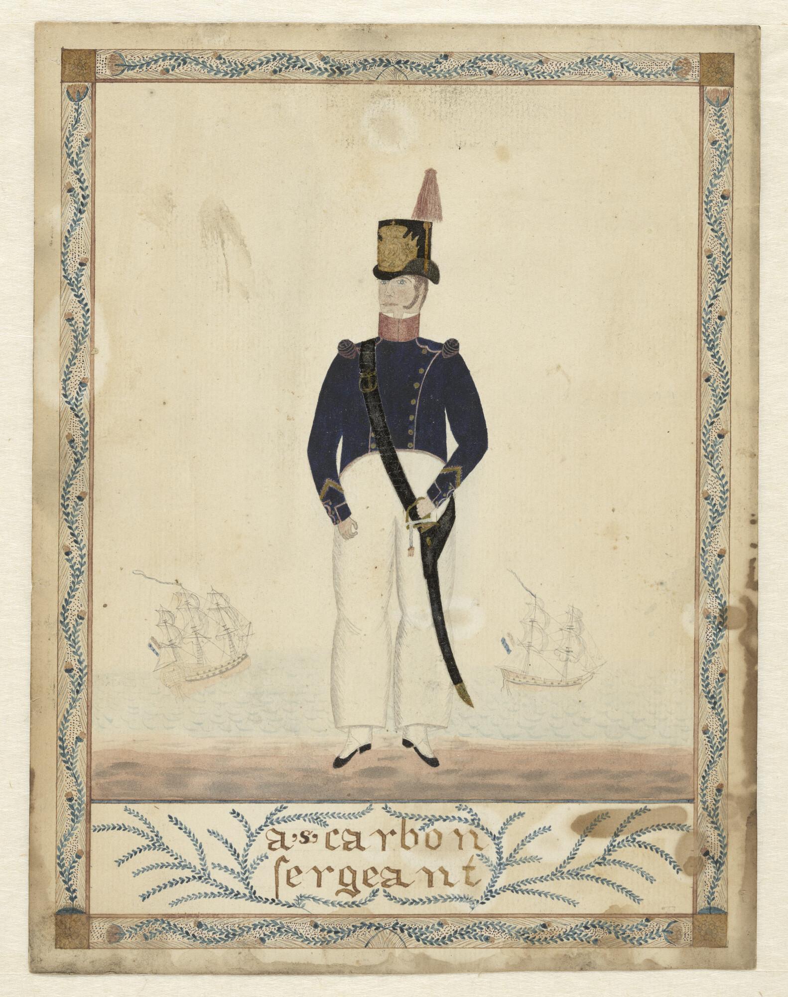 Afbeelding van een geuniformeerde man op een kade, m...