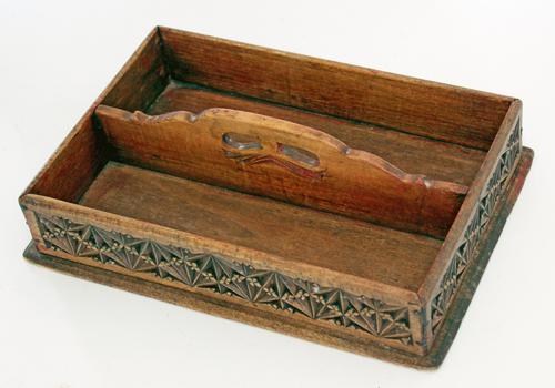Houten bewerkte bestekbak.