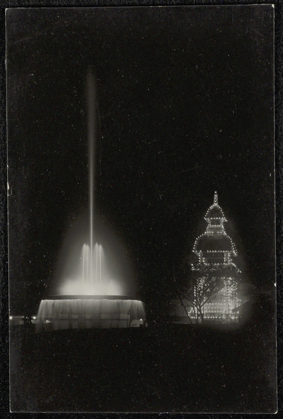 De 's avonds verlichte paviljoens en fonteinen op de...