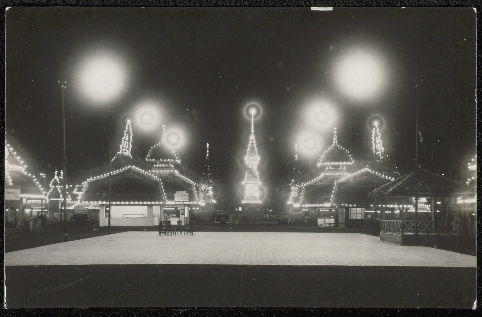De 's avonds verlichte paviljoens op de Pasar Gambir...