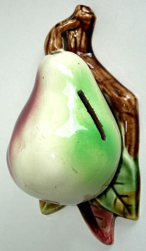 Keramiek spaarpot van een groen rode peer op een bla...