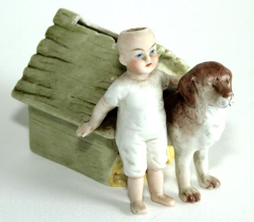 Keramiek spaarpot, jonge met hond bij hok.