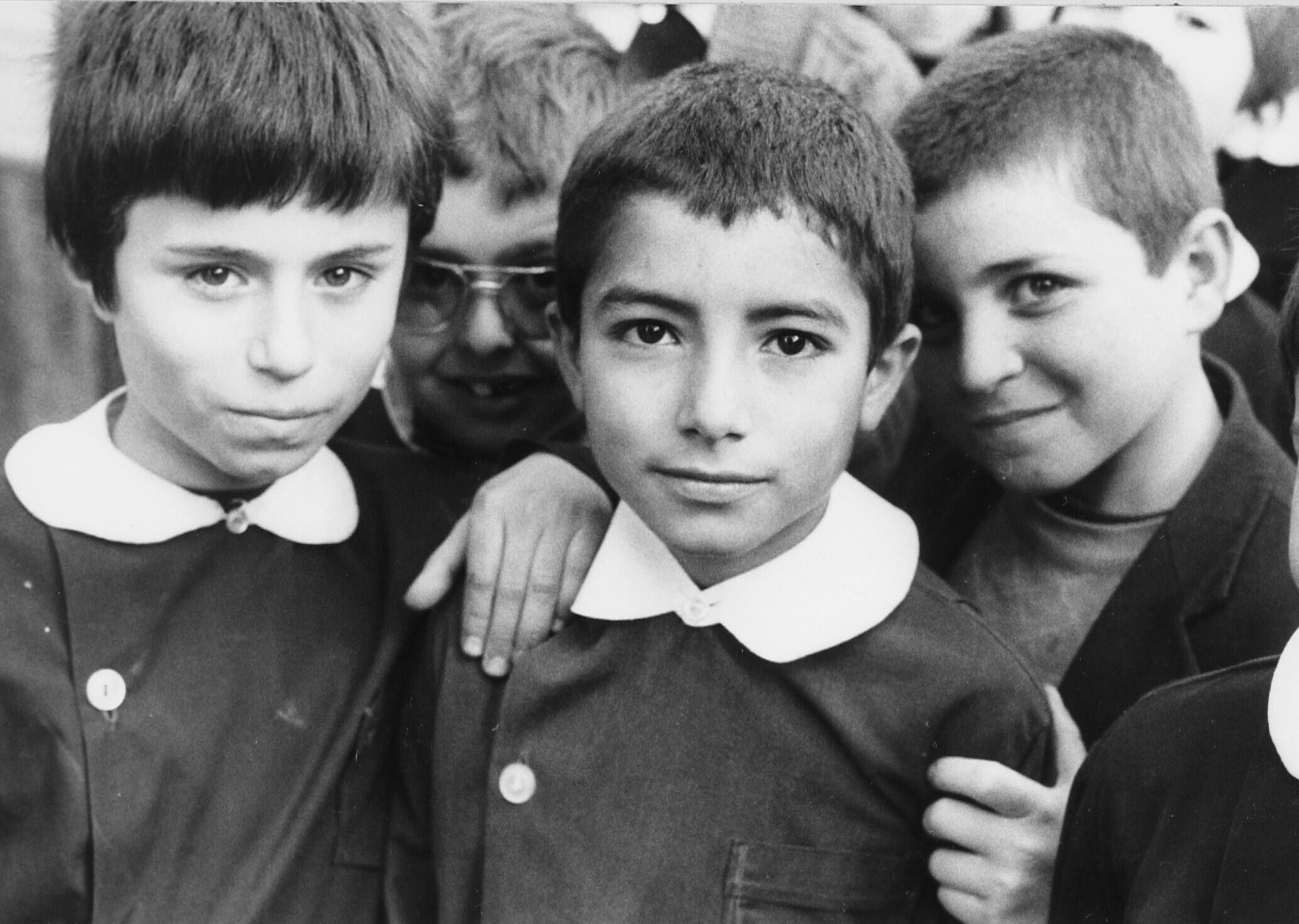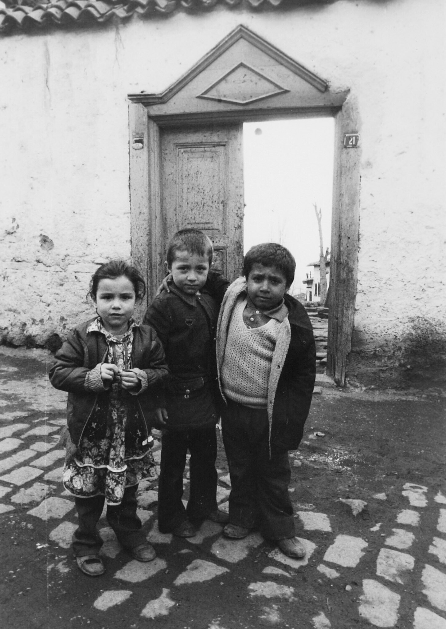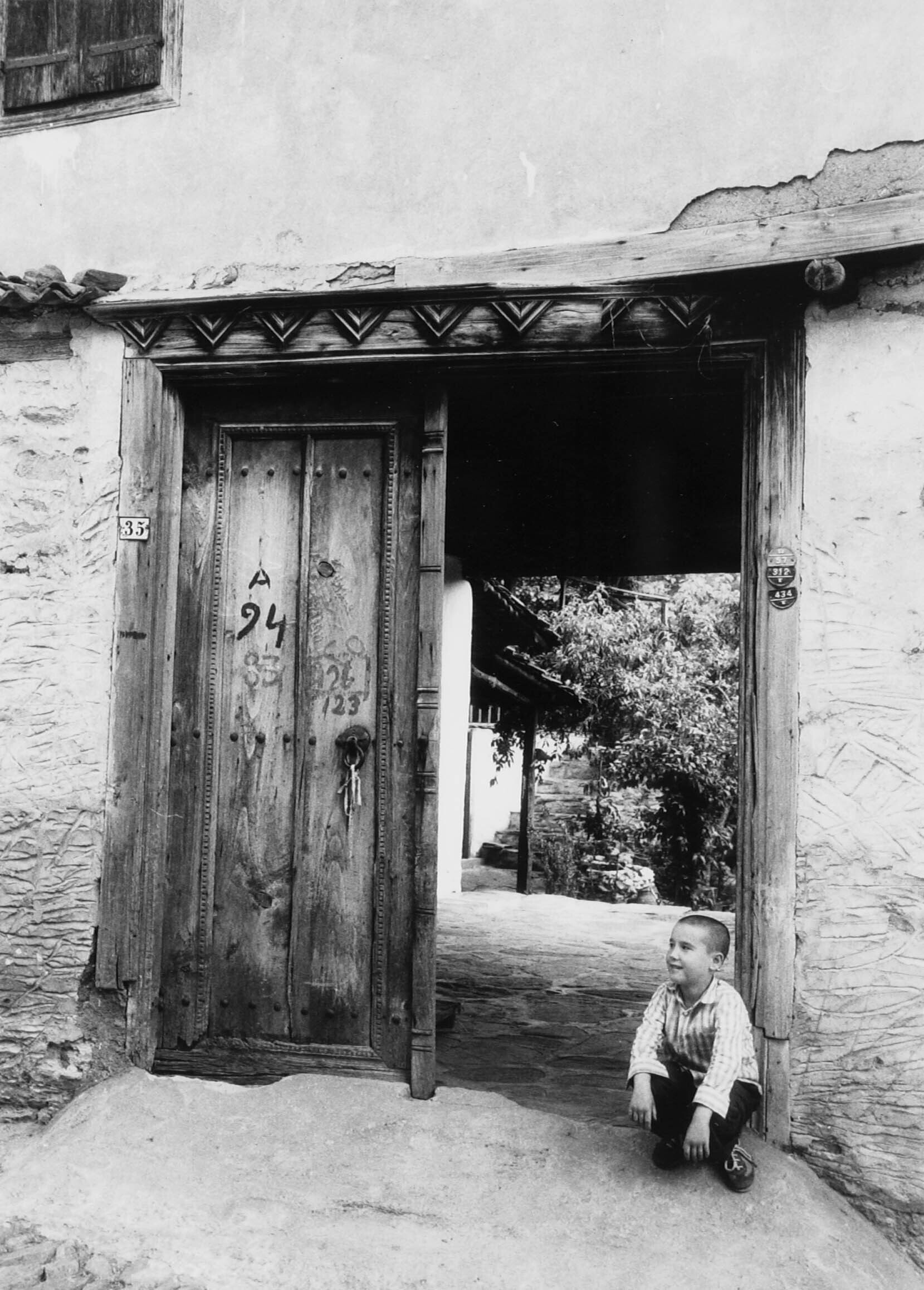 Een jongetje gehurkt voor het huis van zijn ouders, ...