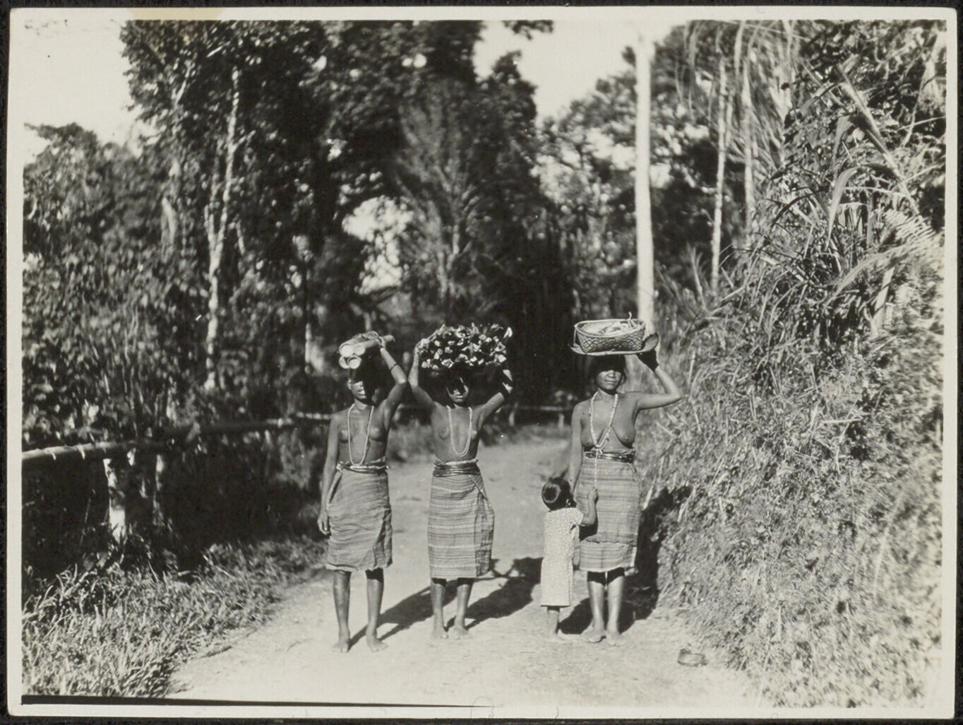 Portret van drie Alfuru vrouwen en een kind op Ceram