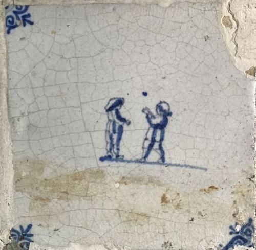 Tegel van aardewerk met tinglazuur voorstellende bal...