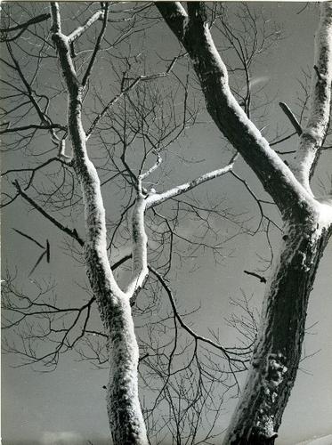 Foto in zwart-wit van een besneeuwde wilg door J.D. ...