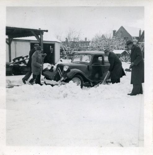 Foto in zwart-wit van een Citroën uit in de sneeuw, ...