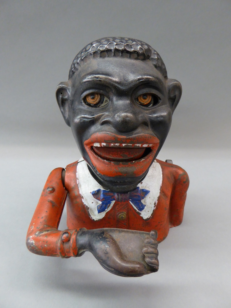 Collectebus in vorm van hoofd van zwarte man met mec...