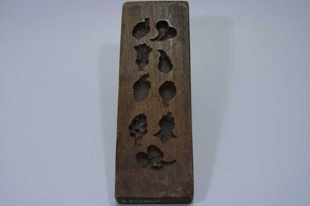 Marsepeinplank van hout met 9 figuren, o.a. een eike...