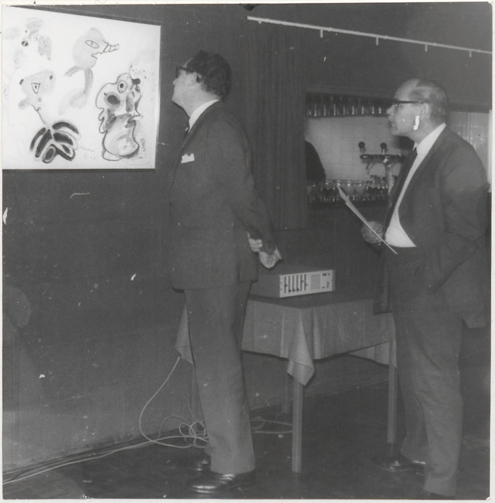 Twee mannen bekijken kunstwerk in café