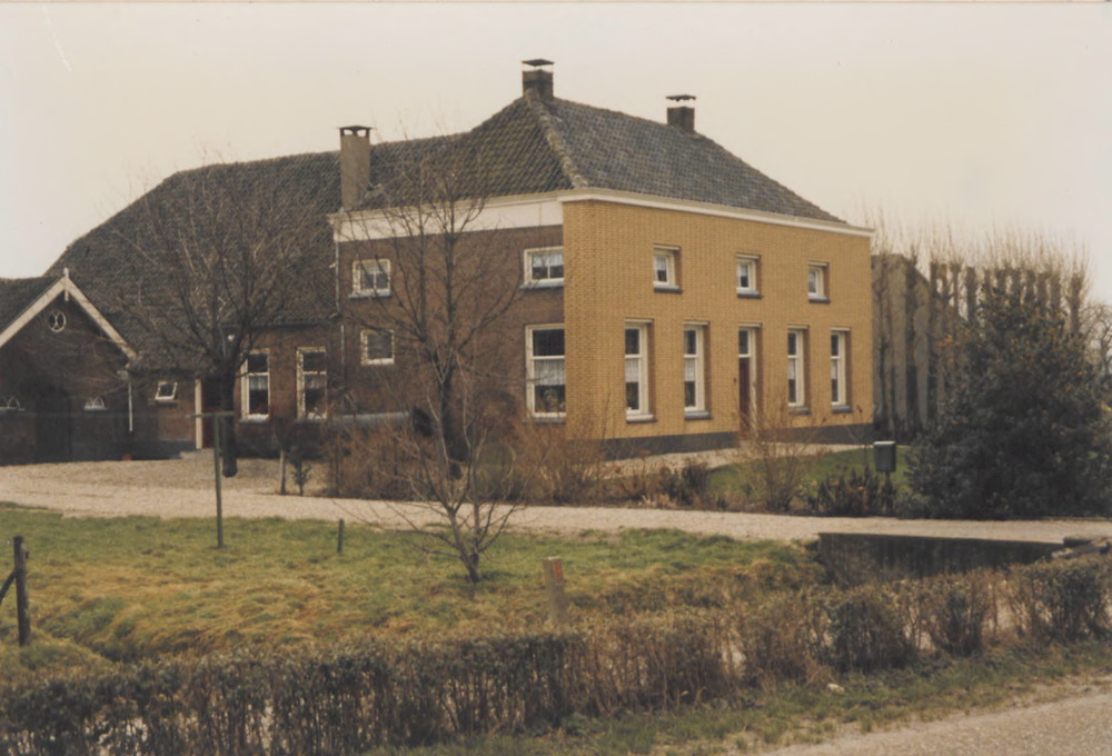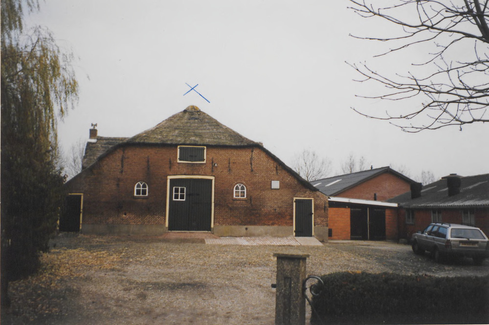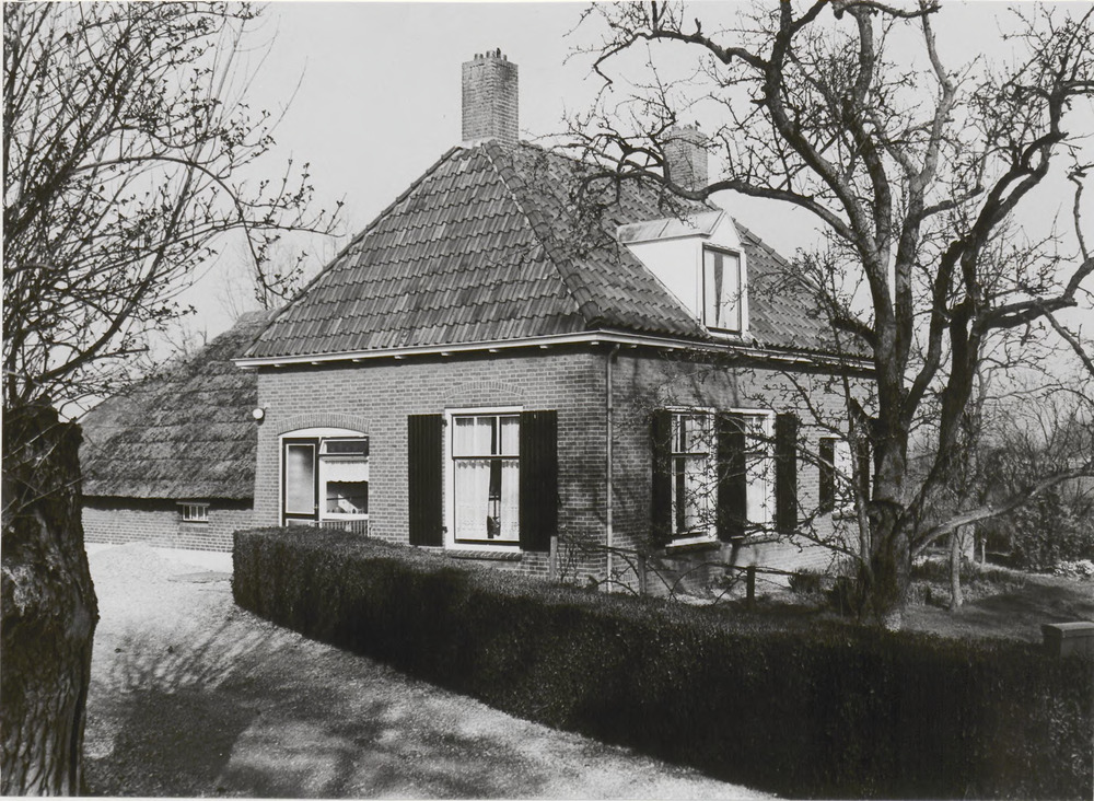 Achterzijde boerderij met erf en schuren. Rechts een...
