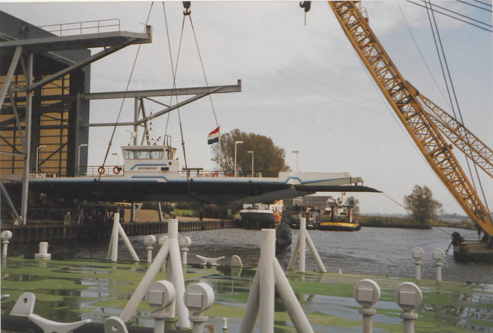 Het veer wordt langzaam van de werfhal weg gehaalt