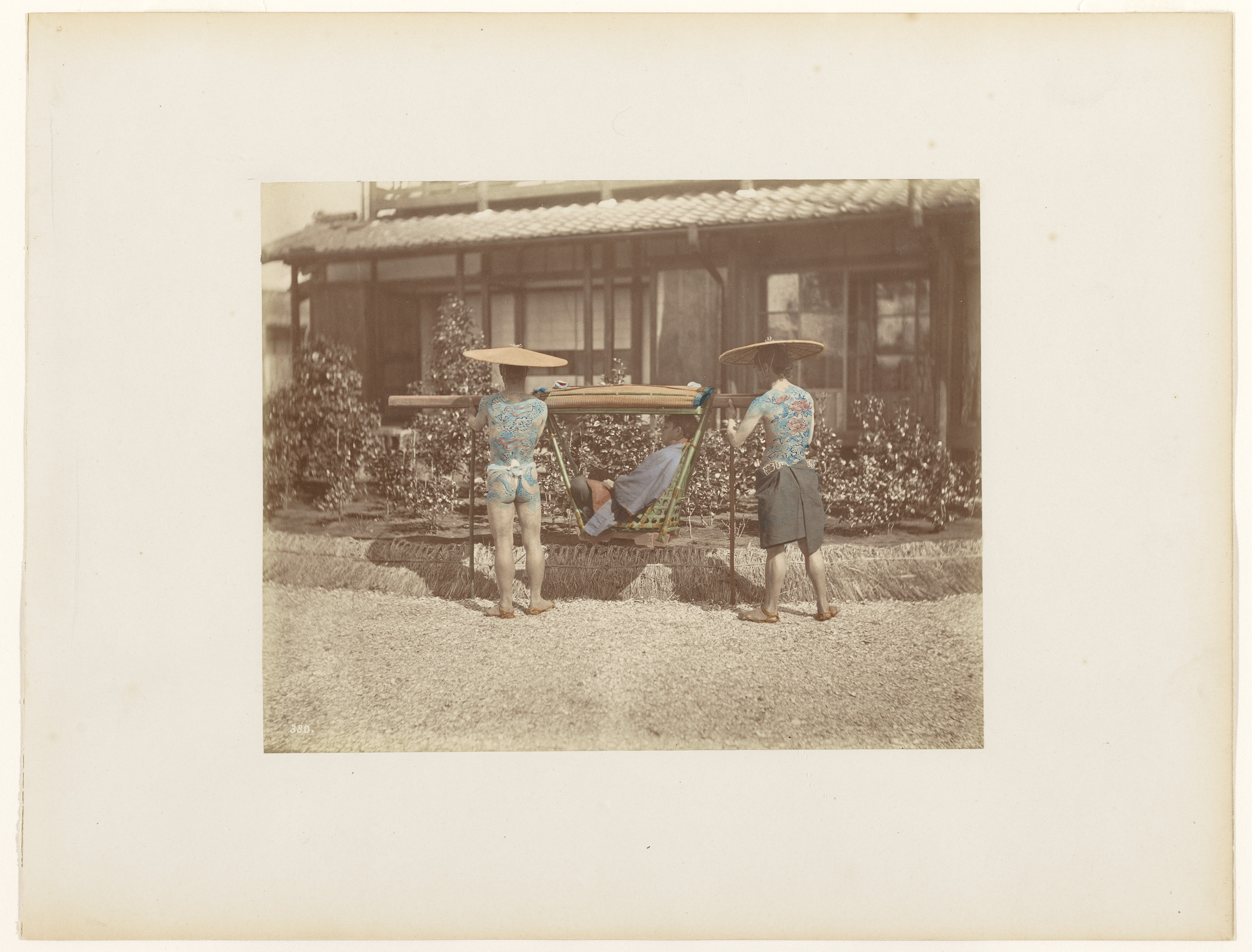 Twee getatoeëerde dragers bij een man in een Kago