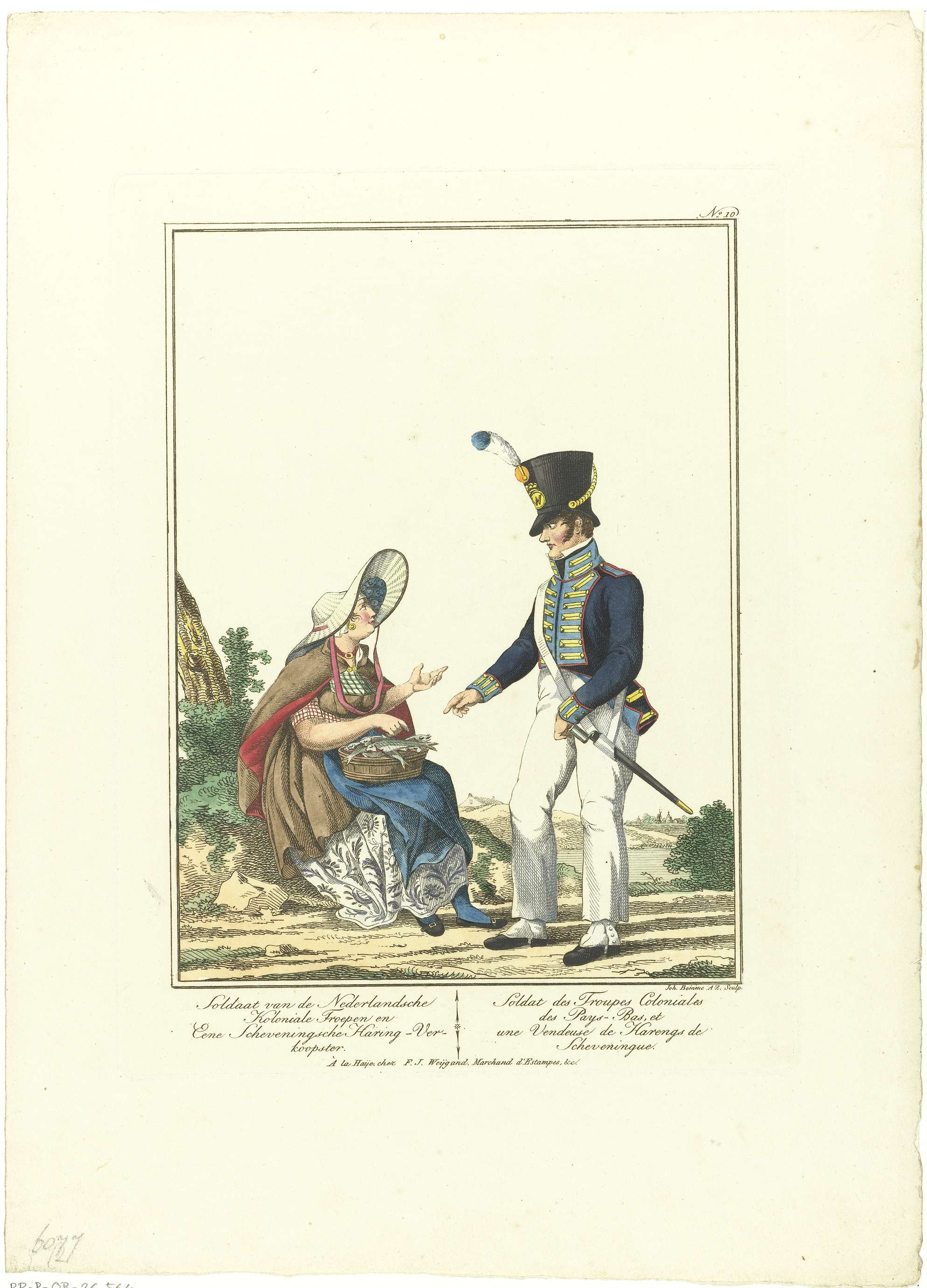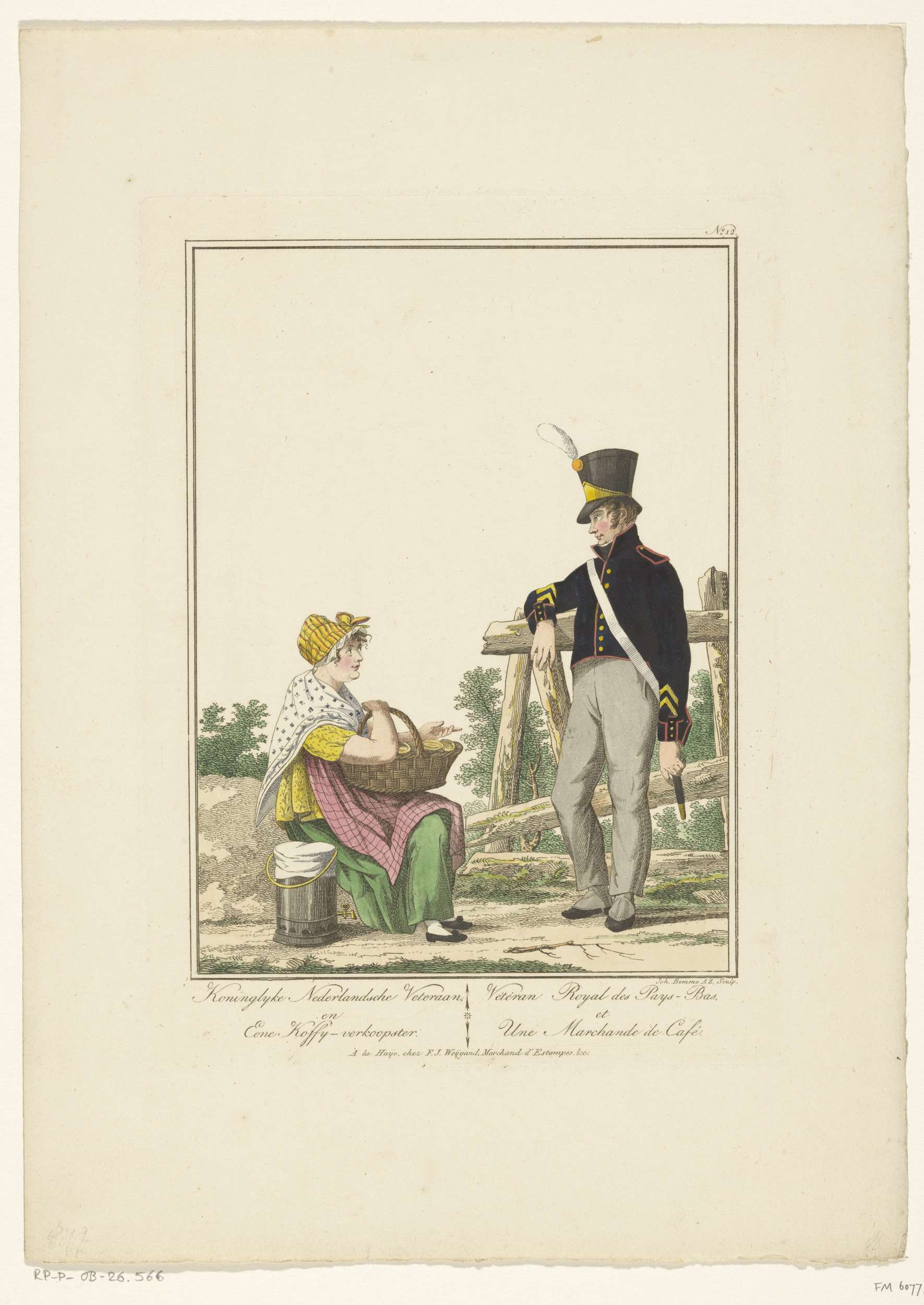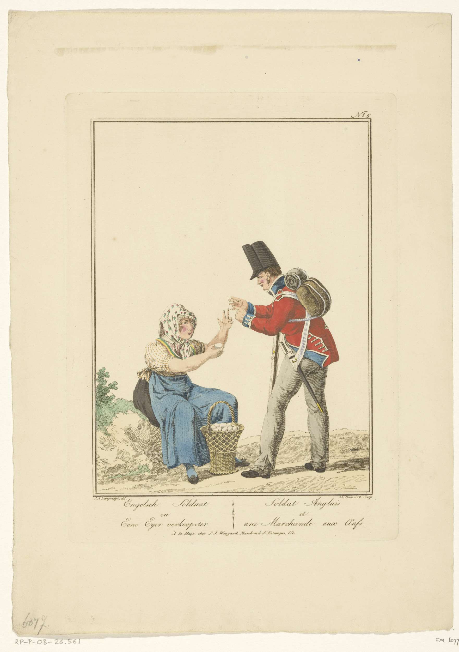 Staande soldaat met zittende eierenverkoopster