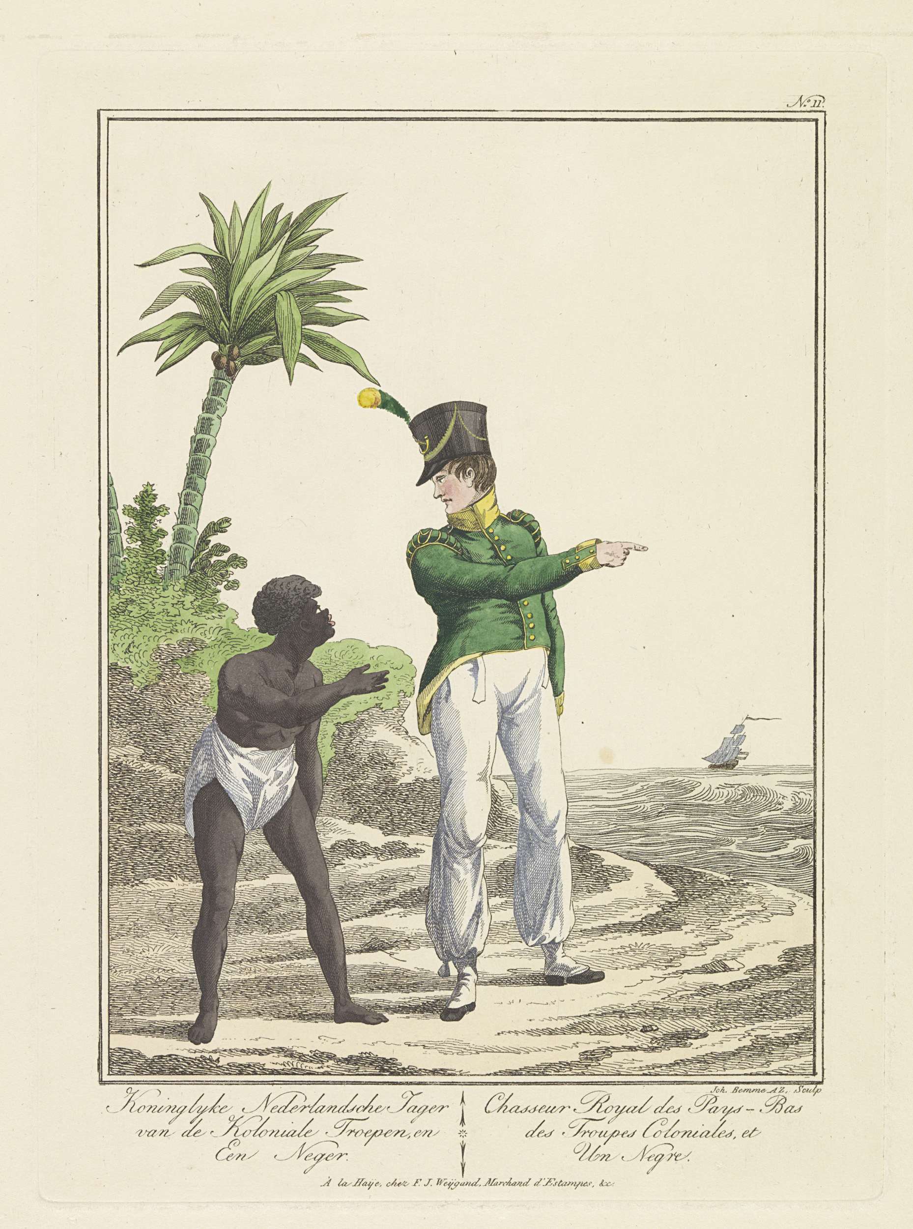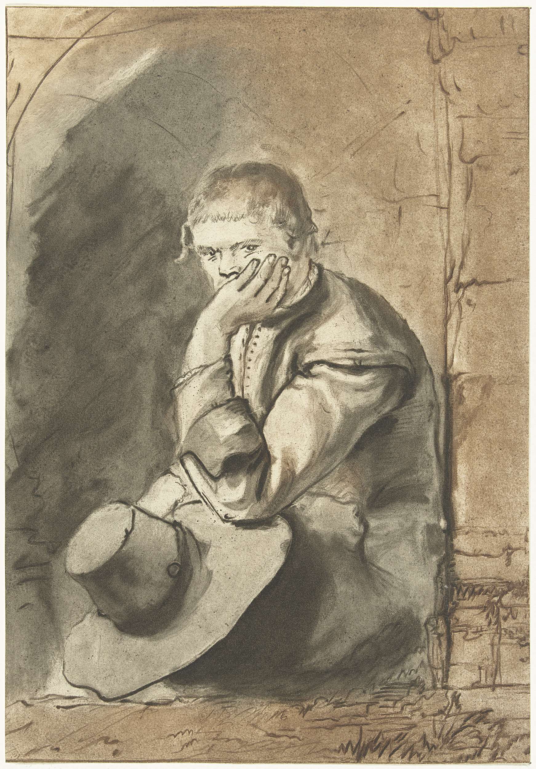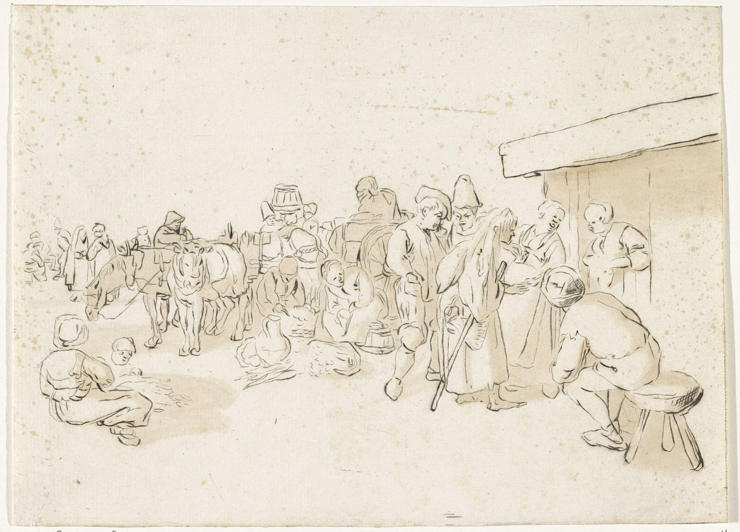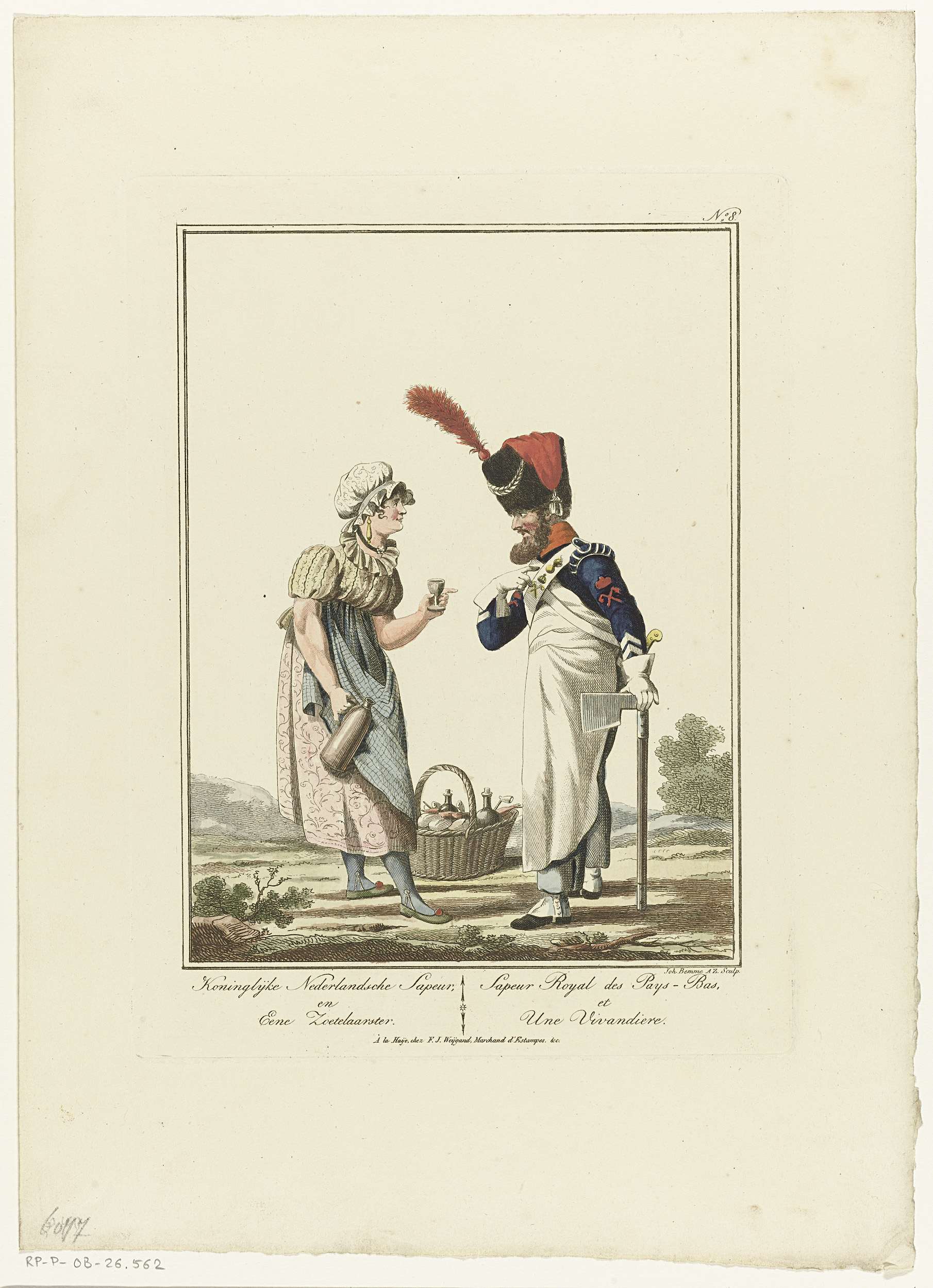 Staande soldaat met zittende eierenverkoopster